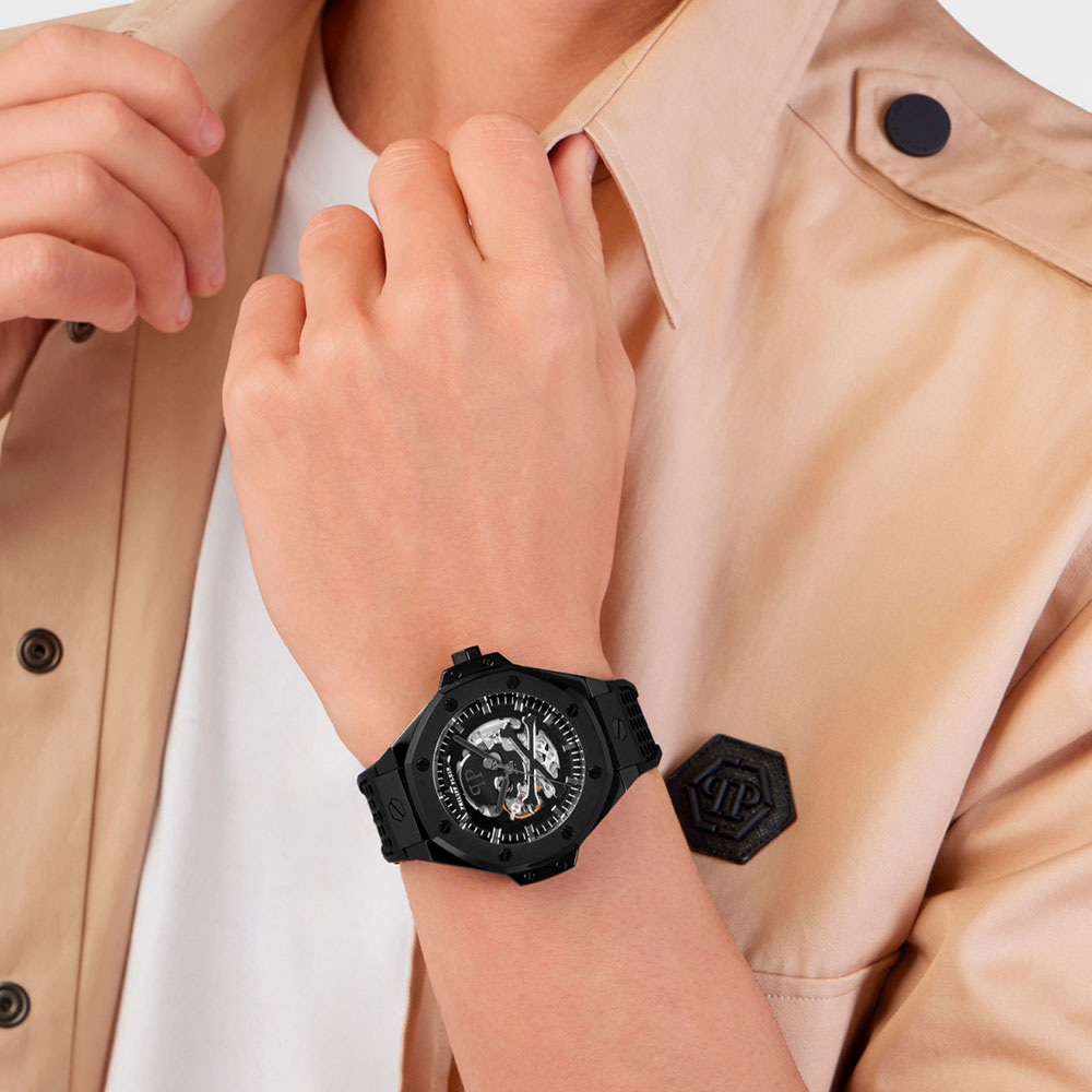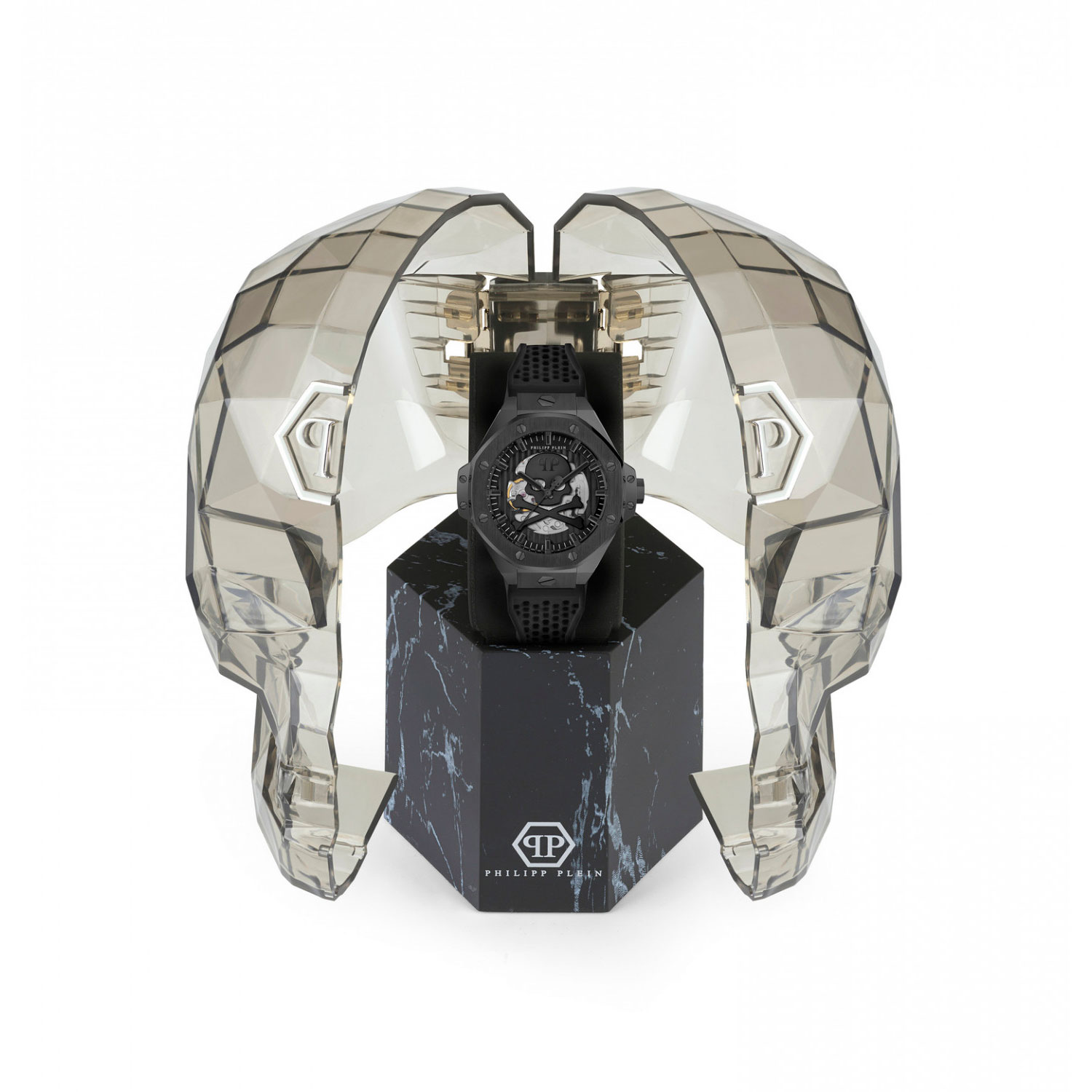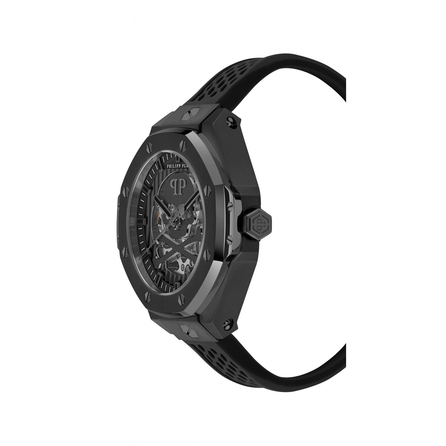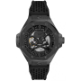 Мужские механические часы с автоподзаводом. Калибр механизма Seiko TMI NH70 на 24х камнях. Центральные часовая, минутная и секундная стрелки. Скелетонизированный черный циферблат с фирменным изображением черепа. Корпус выполнен из нержавеющей стали с черным IP покрытием. Диаметр корпуса составляет 46 мм, толщина 13,5 мм. Черный силиконовый ремешок с перфорацией шириной 23 мм, стандартная застежка. Прочное минеральное стекло устойчивое к мелким механическим повреждениям. Прозрачная задняя крышка. Водостойкость WR 50 (мытье рук, дождь).