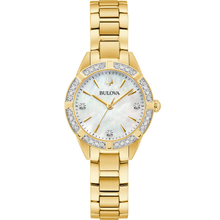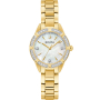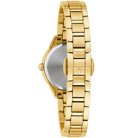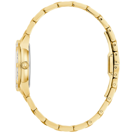 Кварцевые часы. Водостойкость WR 30. Центральные часовая, минутная и секундная стрелки. Перламутровый циферблат с часовыми индексами в виде точек и штрихов. Корпус выполнен из нержавеющей стали с IP покрытием. Диаметр корпуса 28 мм. Устойчивое к возникновению мелких механических повреждений минеральное стекло. Браслет выполнен из нержавеющей стали с IP покрытием. Часы украшены бриллиантами.