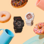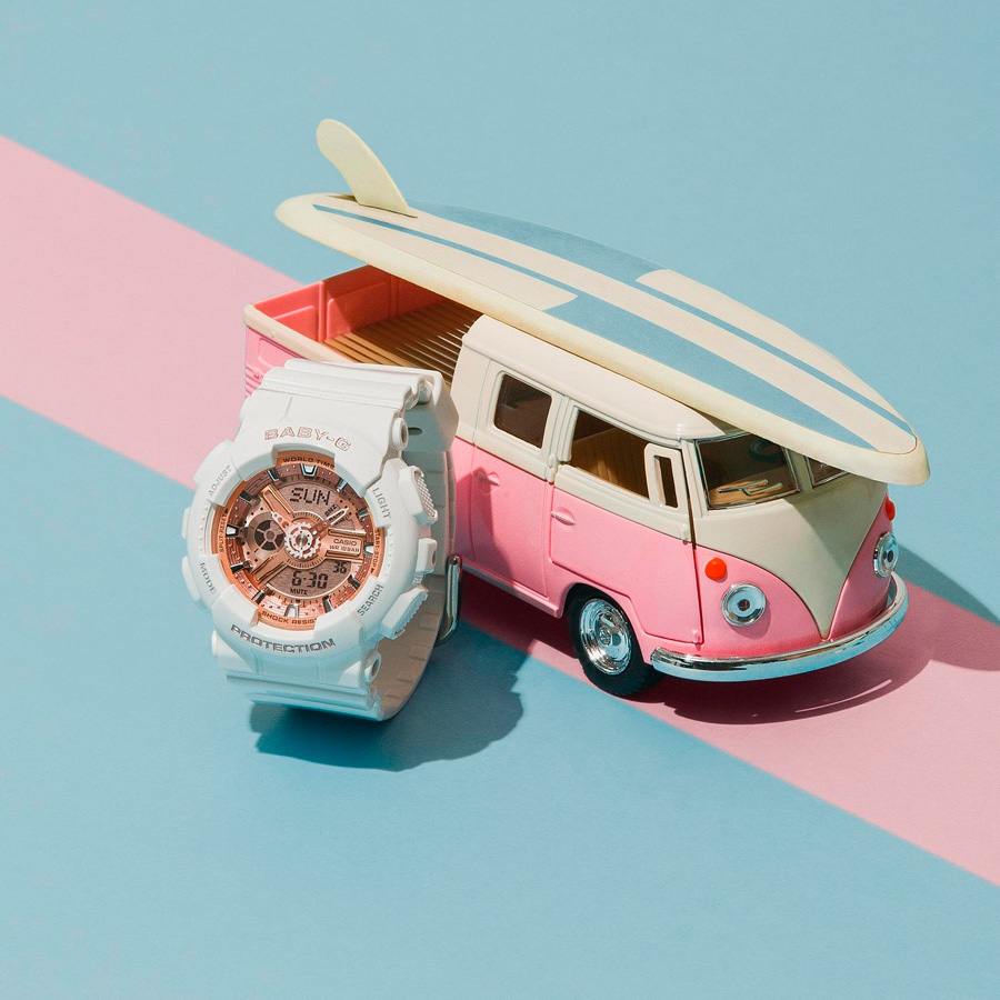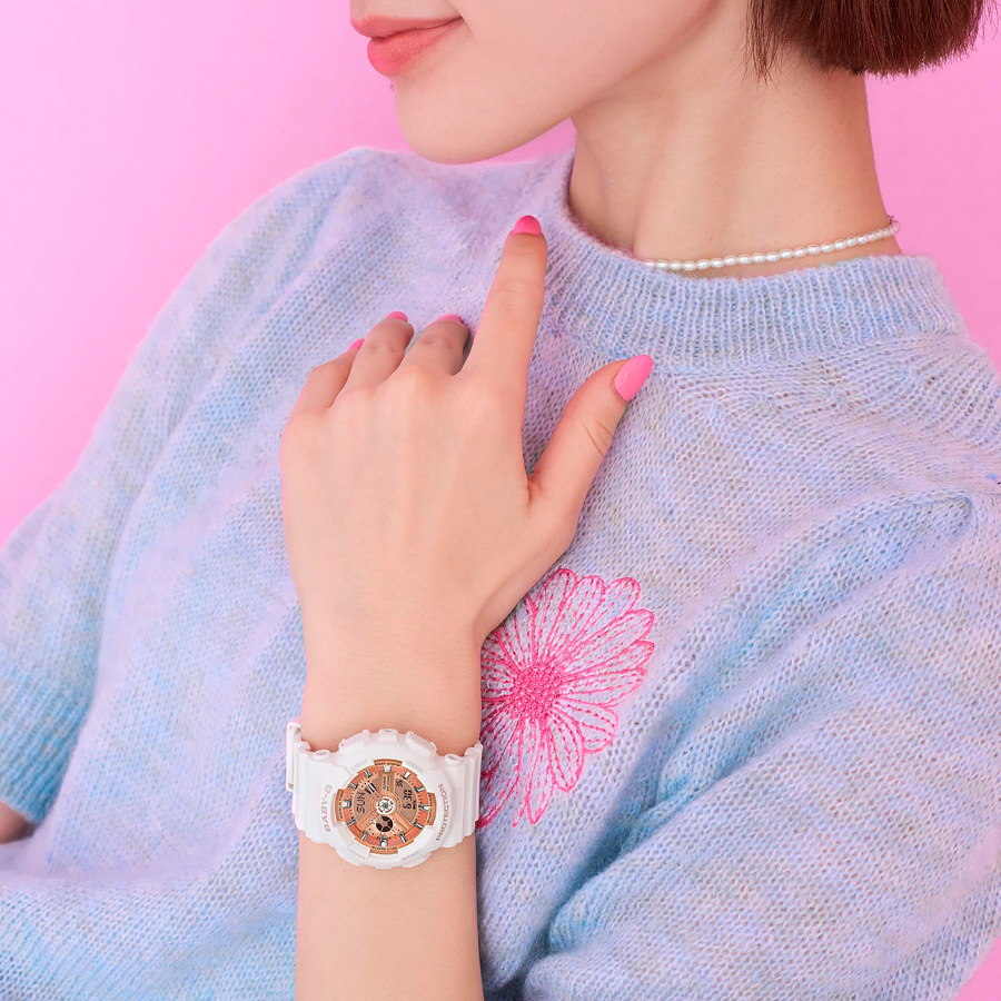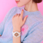 Женские кварцевые часы. Подсветка. Центральные часовая и минутная стрелки. Функция мирового времени - 29 часовых зон (48 городов). Секундомер с точностью 1/100 секунды и пределом измерения 24 часа. Таймер. 5 ежедневных будильника, один из них с функцией повтора будильника. Автоматический календарь. Ежечасный сигнал. 12/24х часовой формат времени. Включение/выключение звука кнопок. Ударопрочный круглый корпус выполнен из полимерного материала. Размеры корпуса 46 мм х 43 мм х 16 мм. Ремешок выполнен из полимерного материала, стандартная застежка. Прочное минеральное стекло устойчивое к мелким механическим повреждениям. Водостойкость WR 100 (плавание без погружения). Вес примерно 45 гр. Срок службы батареи - 2 года.