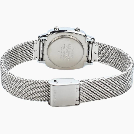 Электронные часы. Водозащита WR 30. Часы, минуты, секунды, 12 часовой формат времени. Секундомер с точностью показаний 1/10. Таймер обратного отсчета. Ежедневный будильник. Автоматический календарь. Корпус выполнен из полимерного материала. Размеры корпуса 20 мм х 25 мм х 8 мм. Пластиковое стекло. Браслет миланского плетения, выполнен из нержавеющей стали.