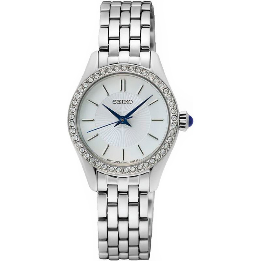 Кварцевые часы. Водостойкость WR 30. Часы устойчивы к воздействию магнитных полей ( 4,800 A/m). Часы, минуты, секунды. Циферблат с часовыми индексами в виде штрихов. Корпус выполнен из нержавеющей стали. Диаметр корпуса 26 мм, толщина 7 мм. Устойчивое к возникновению мелких механических повреждений минеральное стекло повышенной прочности Hardlex. Браслет выполнен из нержавеющей стали. Часы украшены кристаллами.