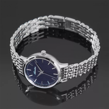 Кварцевые часы. Водостойкость WR 30. Центральные часовая, минутная и секундная стрелки. Синий циферблат с часовыми индексами в виде штрихов. Корпус выполнен из нержавеющей стали. Диаметр корпуса 30 мм, толщина 7 мм. Устойчивое к возникновению мелких механических повреждений минеральное стекло. Браслет выполнен из нержавеющей стали.