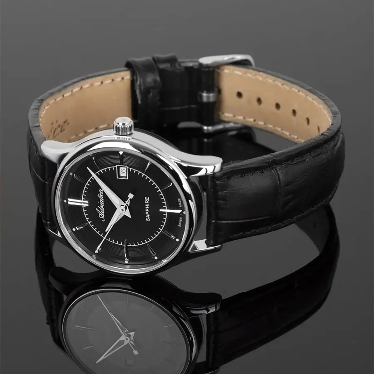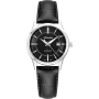Женские кварцевые часы. Калибр механизма Ronda 715. Центральные часовая, минутная и секундная стрелки. Апертура даты в позиции 3 часов. Черный циферблат с часовыми индексами в виде штрихов. Круглый корпус выполнен из нержавеющей стали. Диаметр корпуса составляет 31 мм, толщина 7 мм. Кожаный ремешок черного цвета. Устойчивое к возникновению царапин сапфировое стекло. Водостойкость WR 50 (мытье рук, дождь).