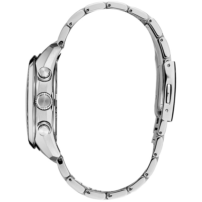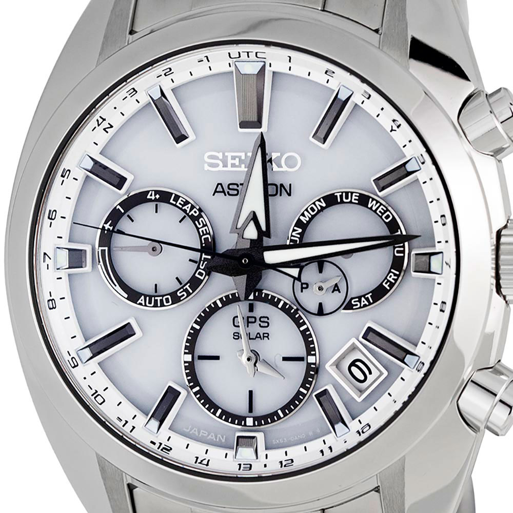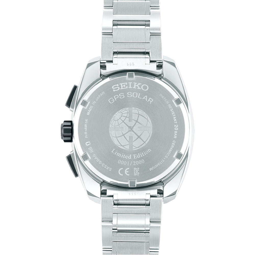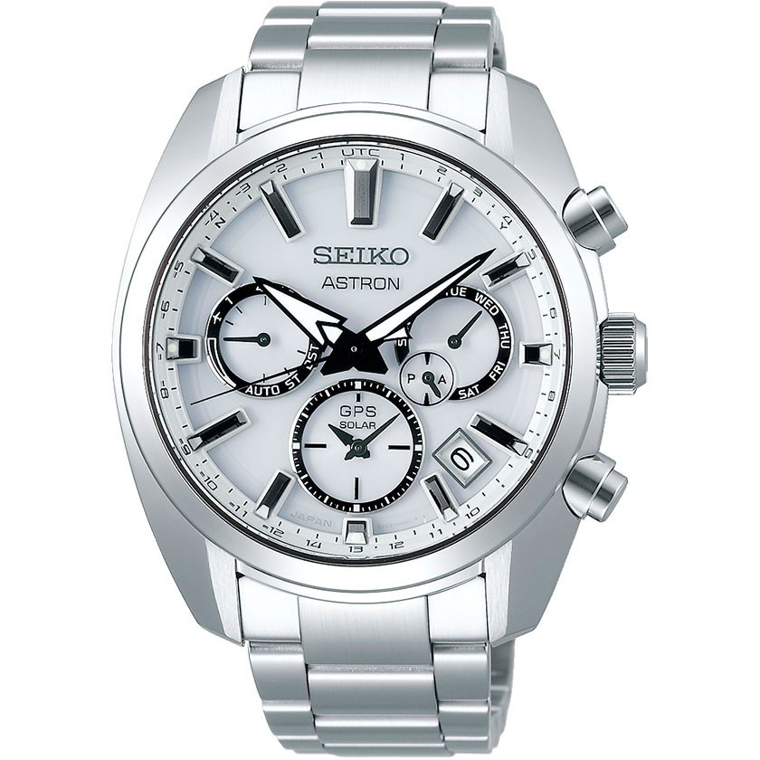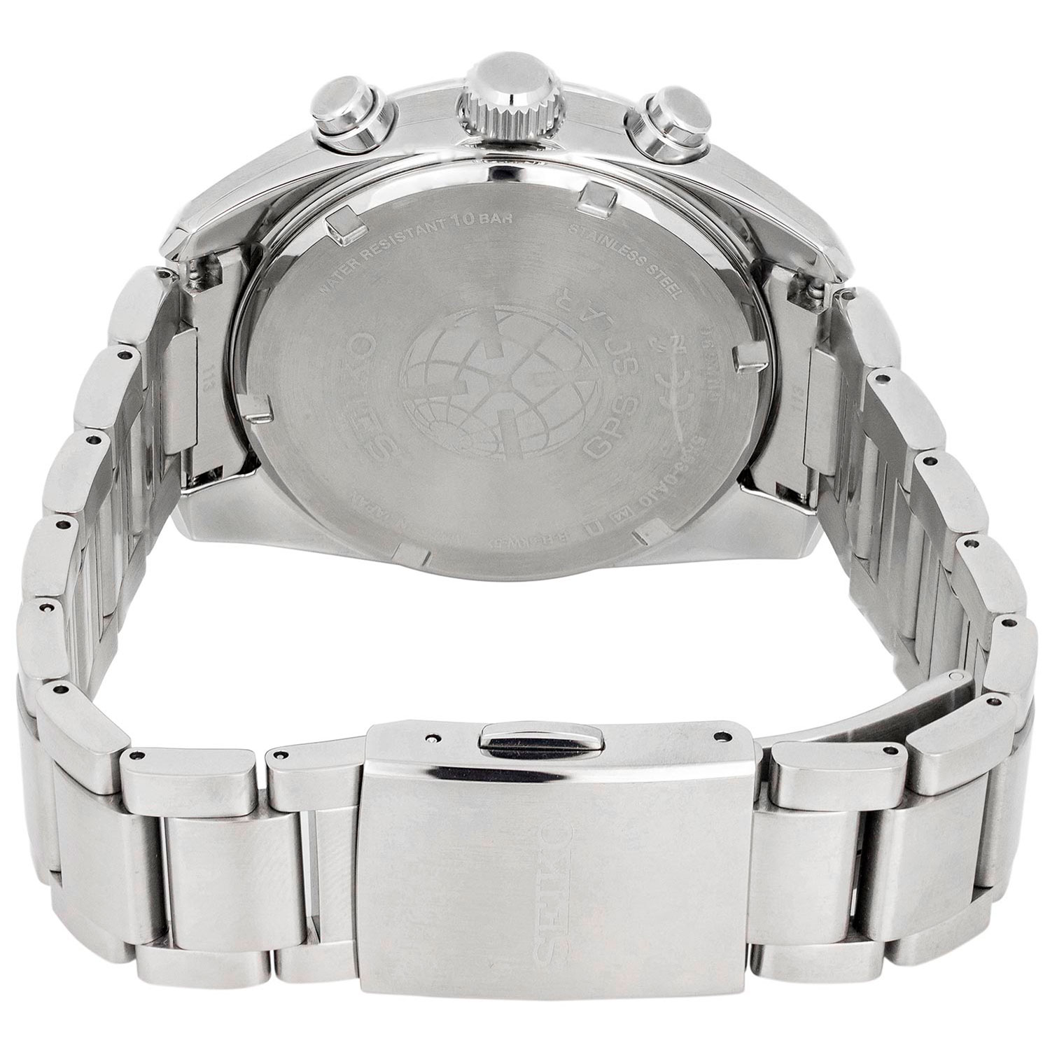 Мужские кварцевые часы. Калибр 5X53. Солнечная батарея. Индикатор заряда батареи. Функция энергосбережения. Время работы без подзарядки до 6 месяцев в обычном режиме, и до 24 месяцев в режиме энергосбережения. Мировое время. Автоматический календарь. Функция летнего времени. Режим полета. Настройка часового пояса и точного времени по GPS. Центральные часовая, минутная и секундная стрелки. Серебристый циферблат с часовыми индексами в виде штрихов. Стрелки и метки с люминесцентным покрытием. Корпус выполнен из полированной нержавеющей стали. Диаметр корпуса 43 мм, толщина 13 мм. Стальной браслет, тройная раскладывающаяся застежка. Устойчивое к возникновению царапин выпуклое сапфировое стекло с антибликовым покрытием. Водостойкость WR 100 (плавание без погружения).
