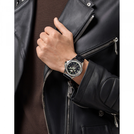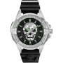Мужские кварцевые часы. Центральные часовая, минутная и секундная стрелки. Черный циферблат с изображением черепа. Люминесцентные стрелки и часовые метки. Круглый корпус выполнен из нержавеющей стали. Диаметр корпуса составляет 44 мм, толщина 14,4 мм. Заводная головка с защитой. Черный силиконовый ремешок, стандартная застежка. Прочное минеральное стекло устойчивое к мелким механическим повреждениям. Водостойкость WR 50 (мытье рук, дождь).