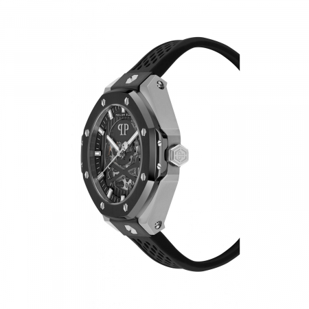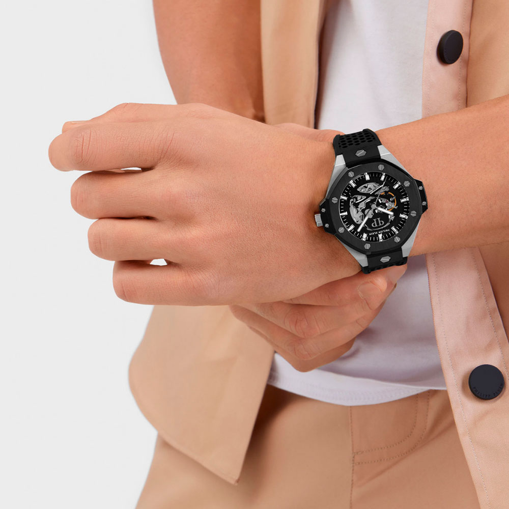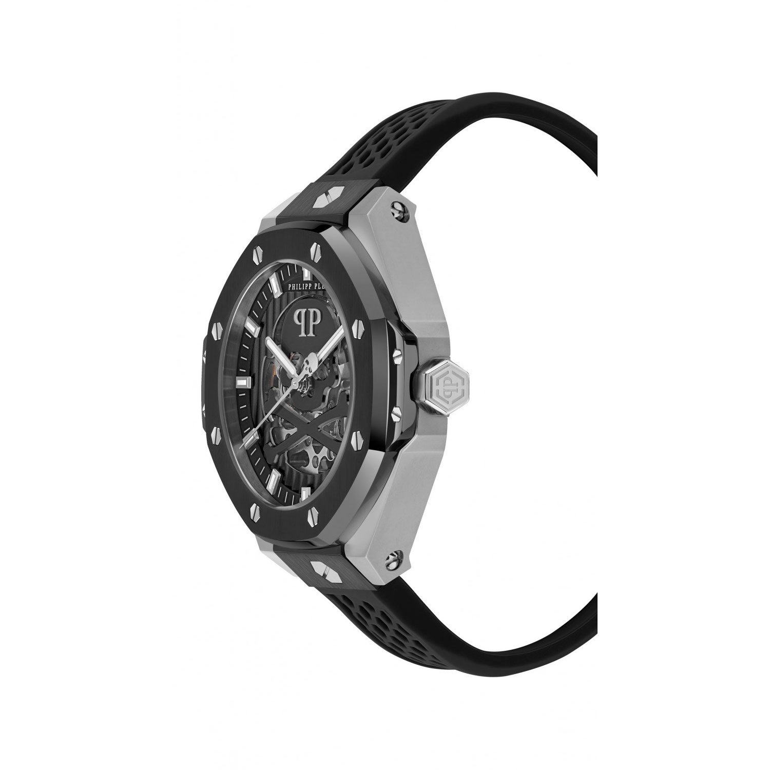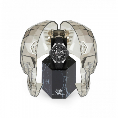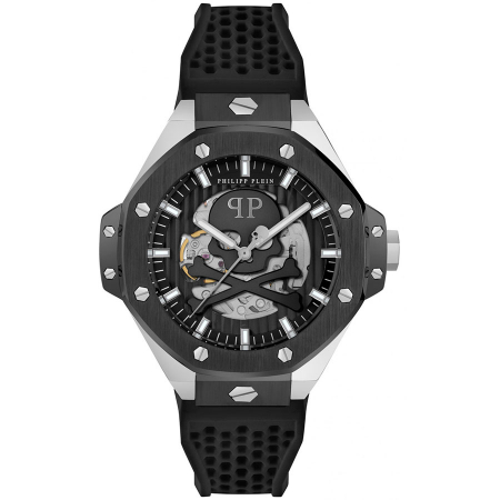 Мужские механические часы с автоподзаводом. Калибр механизма Seiko TMI NH70 на 24х камнях. Центральные часовая, минутная и секундная стрелки. Скелетонизированный черный циферблат с фирменным изображением черепа. Корпус выполнен из нержавеющей стали с частичным черным IP покрытием. Диаметр корпуса составляет 46 мм, толщина 13,5 мм. Черный силиконовый ремешок с перфорацией шириной 23 мм, стандартная застежка. Прочное минеральное стекло устойчивое к мелким механическим повреждениям. Прозрачная задняя крышка. Водостойкость WR 50 (мытье рук, дождь).
