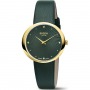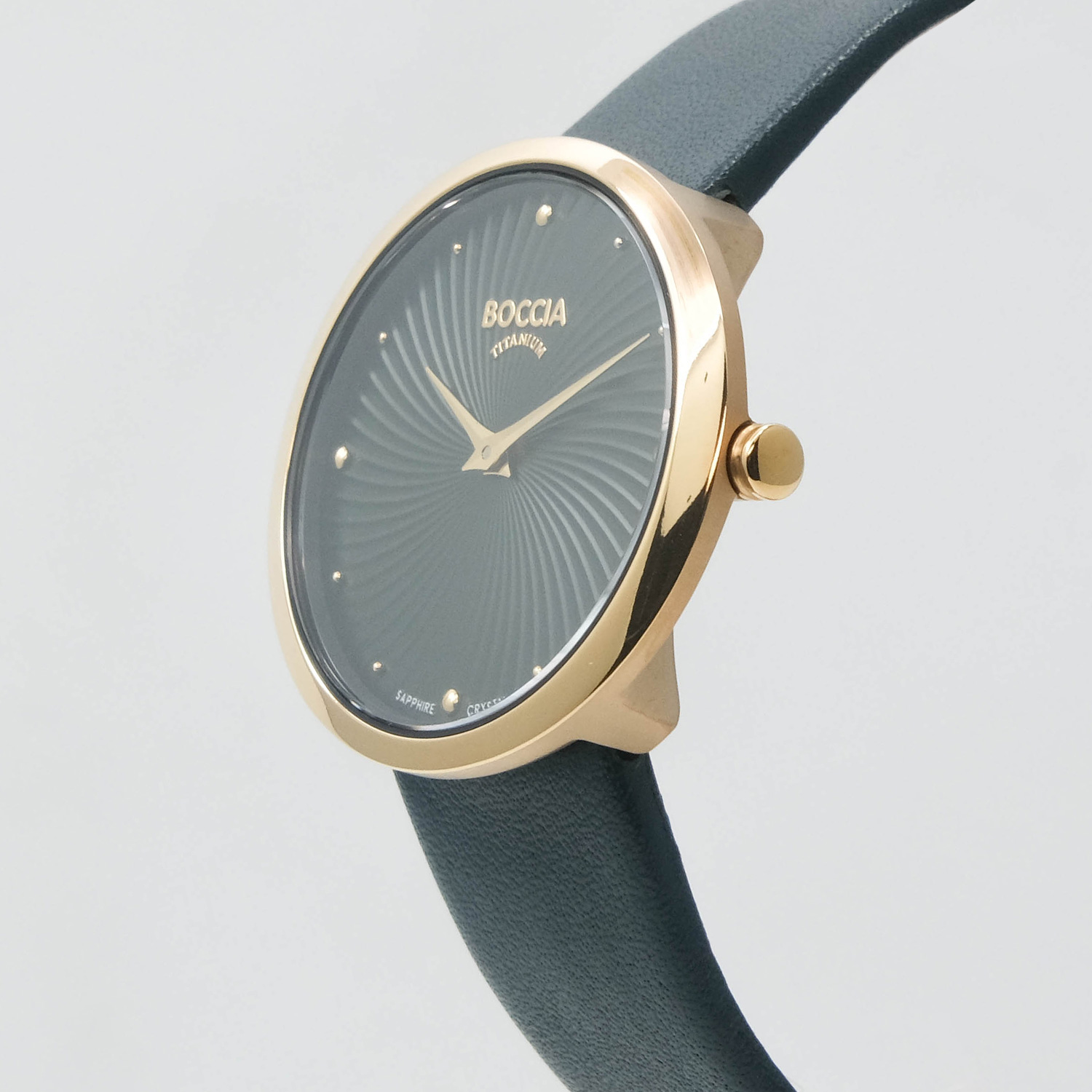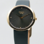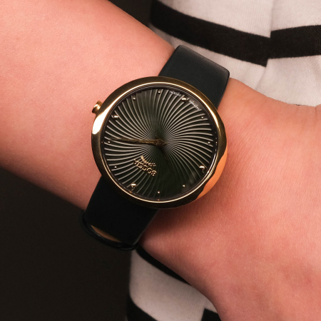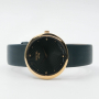 Женские кварцевые часы. Калибр механизма Miyota GL22. Центральные часовая и минутная стрелки. Черный гильошированный циферблат. Овальный корпус выполнен из суперлегкого титана с PVD покрытием цвета желтого золота. Размер корпуса составляет 30 х 32 мм. Черный кожаный ремешок, стандартная застежка. Устойчивое к возникновению царапин сапфировое стекло. Водостойкость WR 50 (мытье рук, дождь).