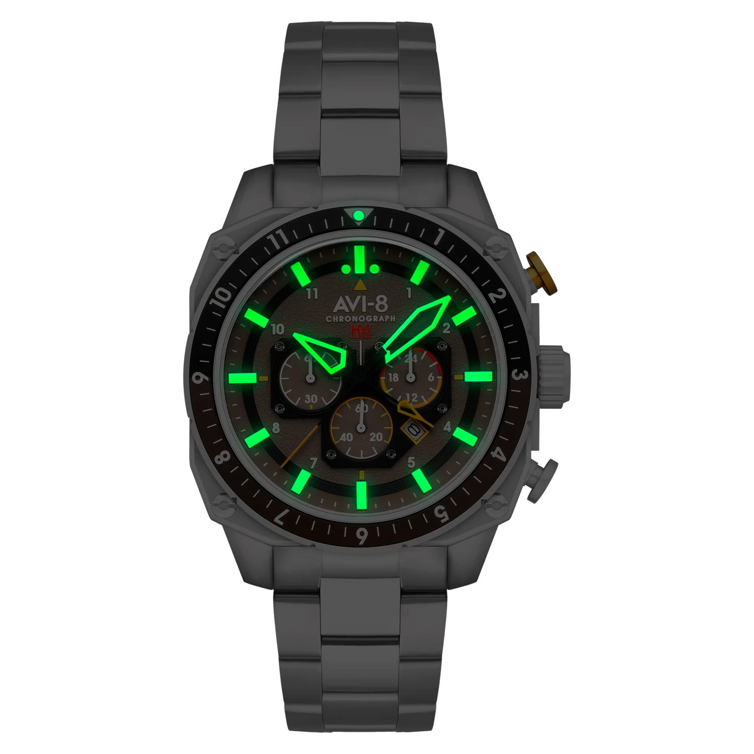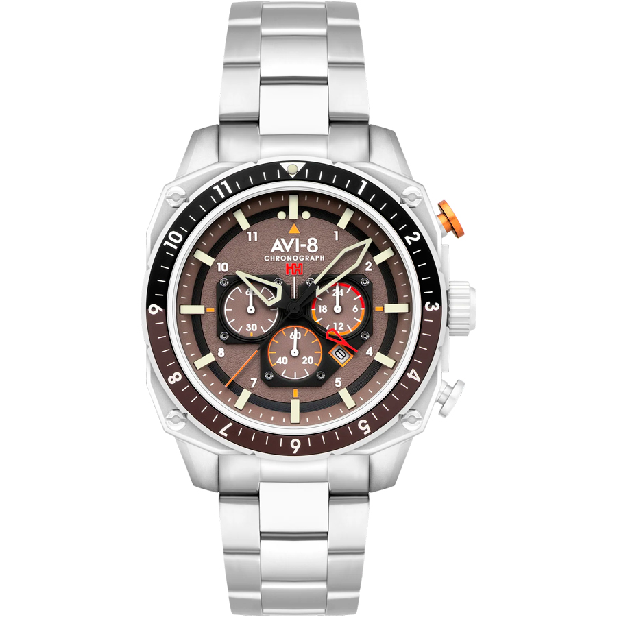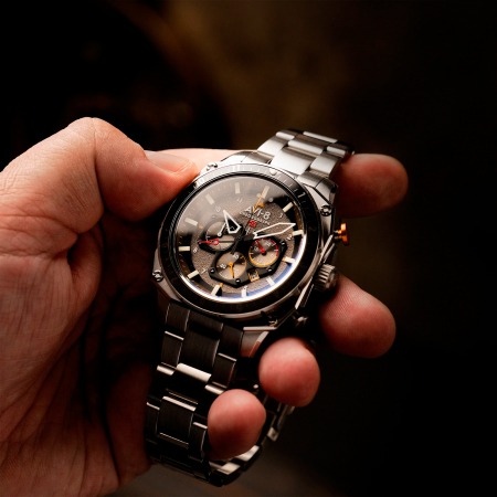 Кварцевый хронограф. Водостойкость WR 50 (мытье рук, дождь). Часы, минуты, секунды. Индикация даты. Второй часовой пояс. Стрелки и метки с люминесцентным покрытием. Циферблат с часовыми индексами в виде штрихов и цифр. Корпус выполнен из нержавеющей стали. Диаметр корпуса 44 мм, толщина 14 мм. Устойчивое к возникновению мелких механических повреждений минеральное стекло с антибликовым покрытием. Браслет выполнен из нержавеющей стали. Ширина браслета 22 мм.