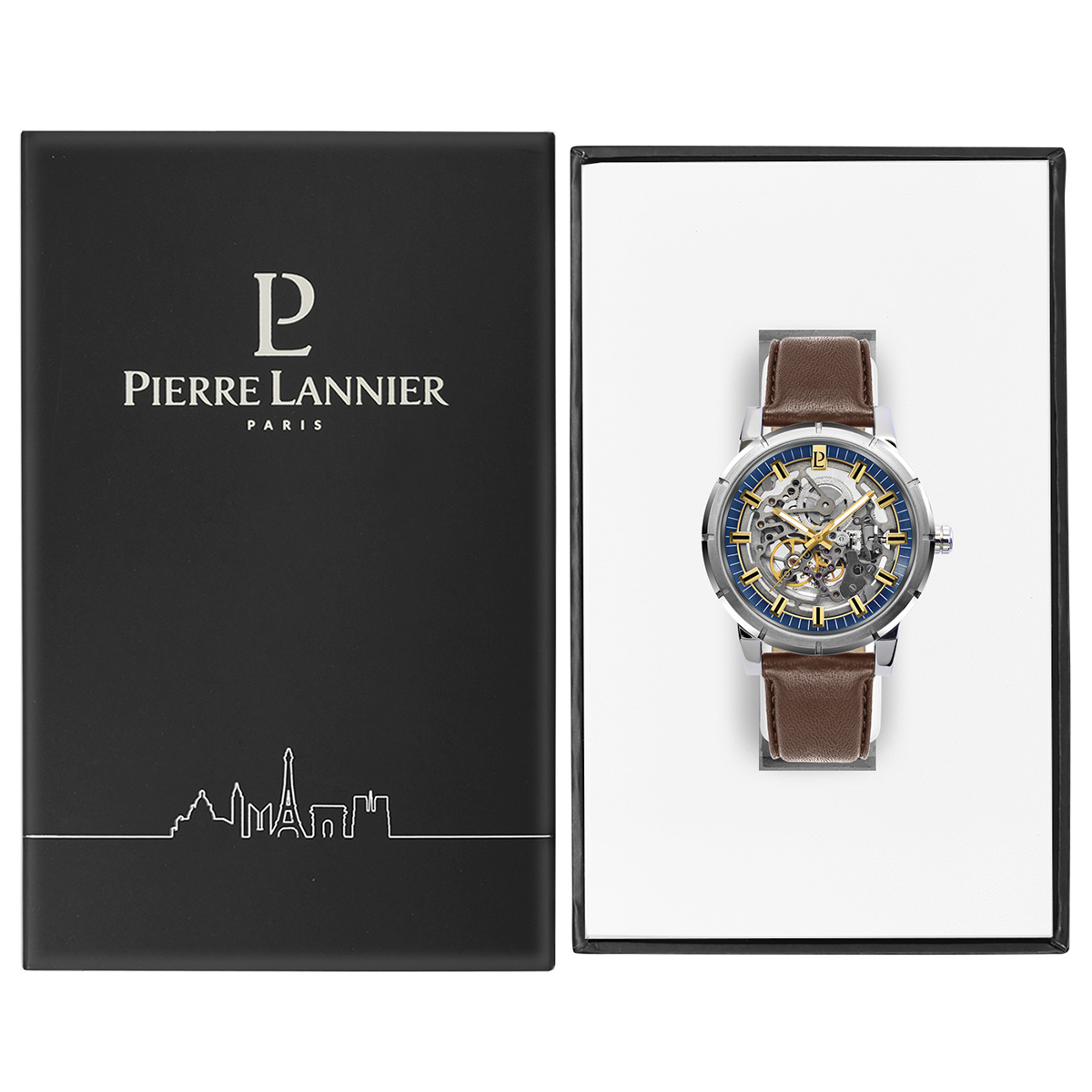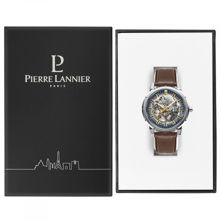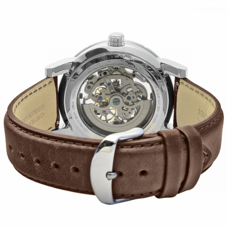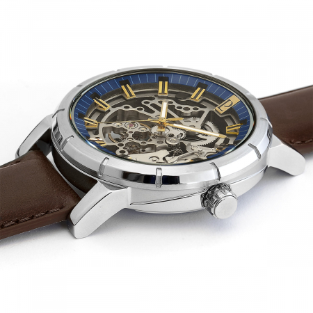 Мужские механические часы с автоподзаводом. Центральные часовая, минутная и секундная стрелки. Серебристо-синий скелетонизированный циферблат. Круглый корпус выполнен из полированной нержавеющей стали. Диаметр корпуса составляет 45 мм, толщина 12 мм. Коричневый кожаный ремешок шириной 22 мм, стандартная застежка. Прочное минеральное стекло устойчивое к мелким механическим повреждениям. Прозрачная задняя крышка. Водостойкость WR 50 (мытье рук, дождь).