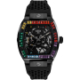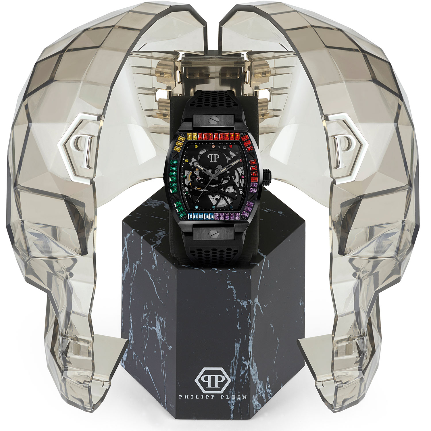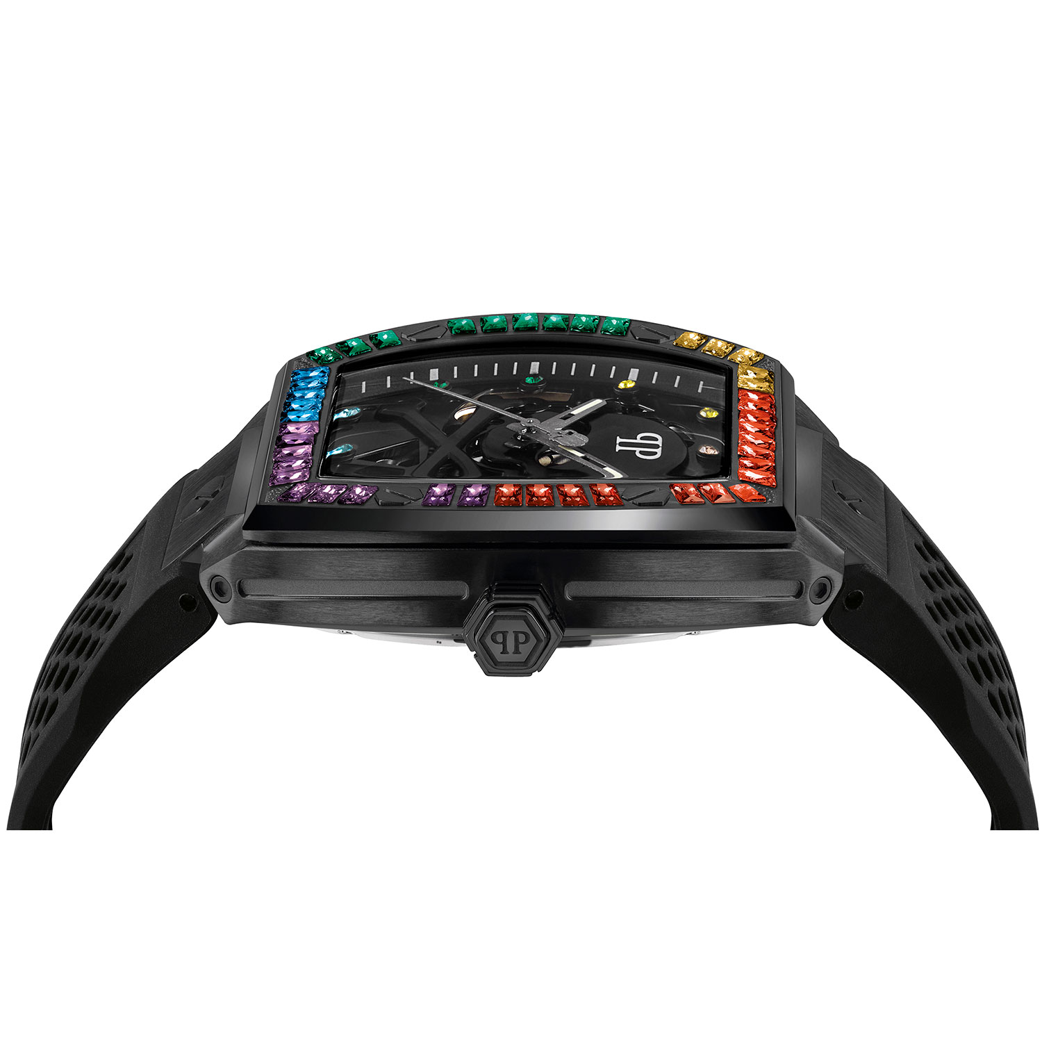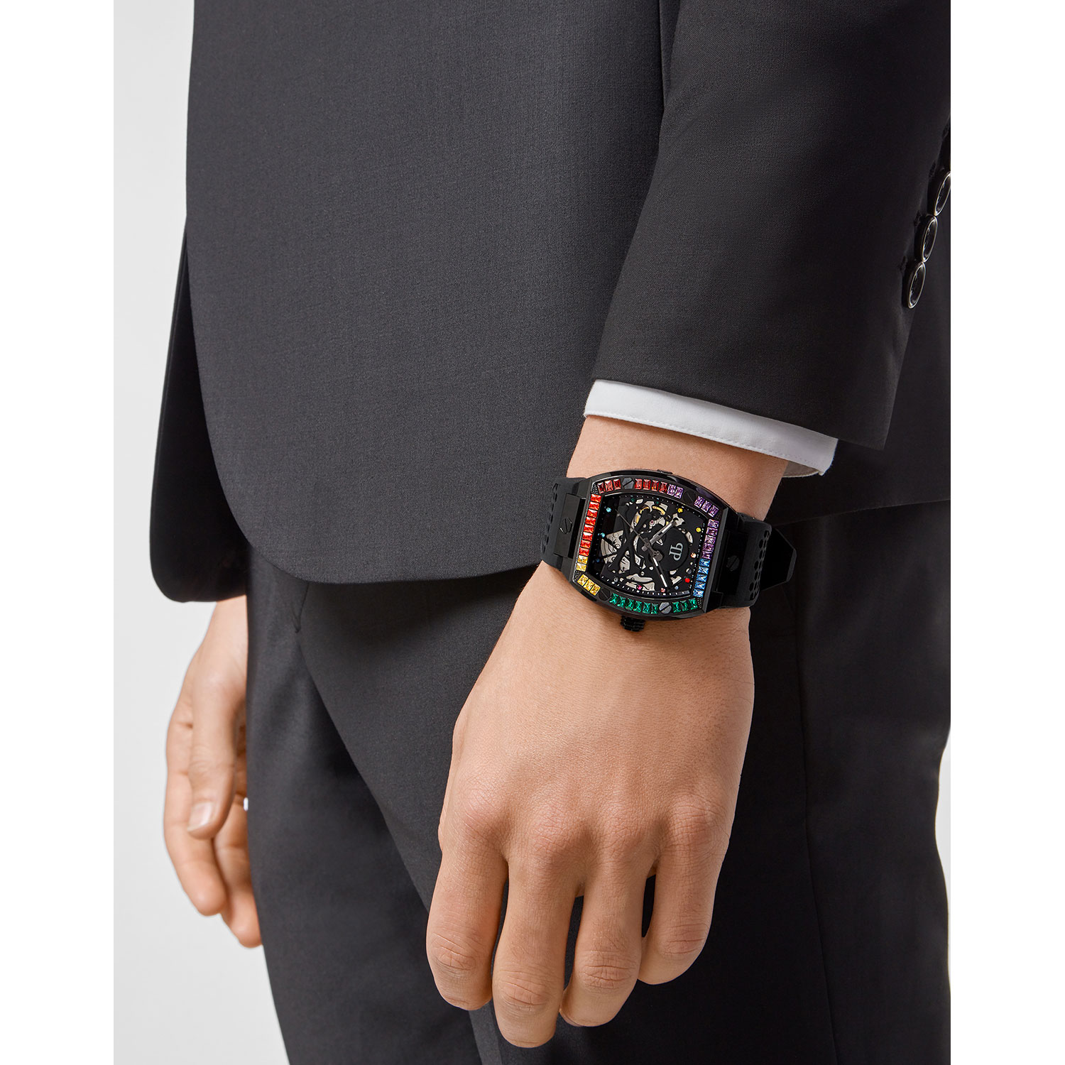 Мужские механические часы с автоподзаводом. Центральные часовая, минутная и секундная стрелки. Черный скелетонизированный циферблат с изображением черепа. Корпус формы тонно выполнен из нержавеющей стали с черным IP покрытием и декорирован разноцветными кристаллами Swarovski по безелю. Диаметр корпуса составляет 44 мм, толщина 14 мм. Черный силиконовый ремешок с перфорацией, стандартная застежка. Прочное минеральное стекло устойчивое к мелким механическим повреждениям. Водостойкость WR 50 (мытье рук, дождь).