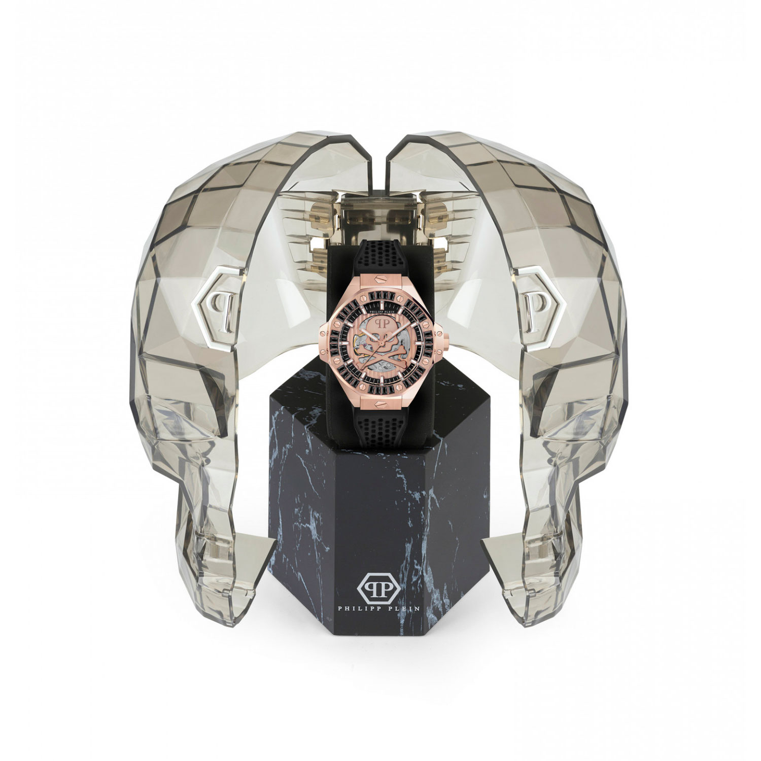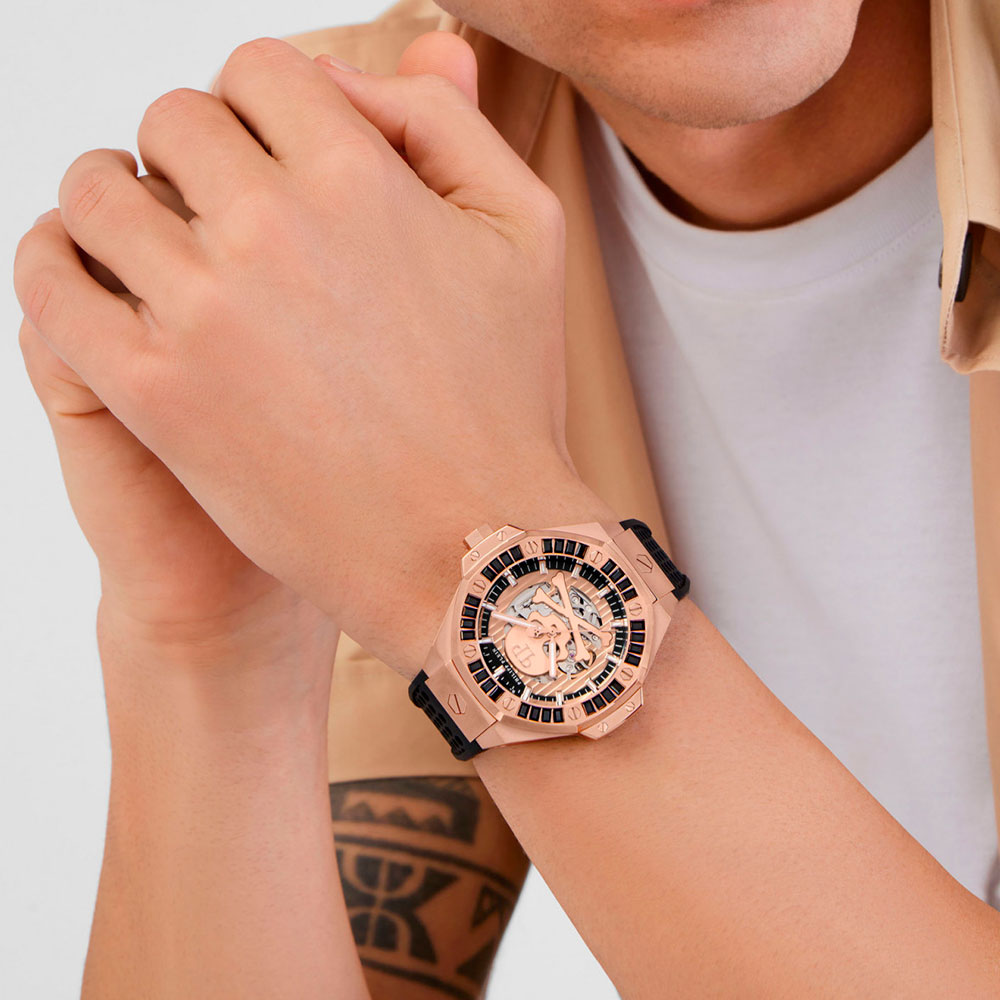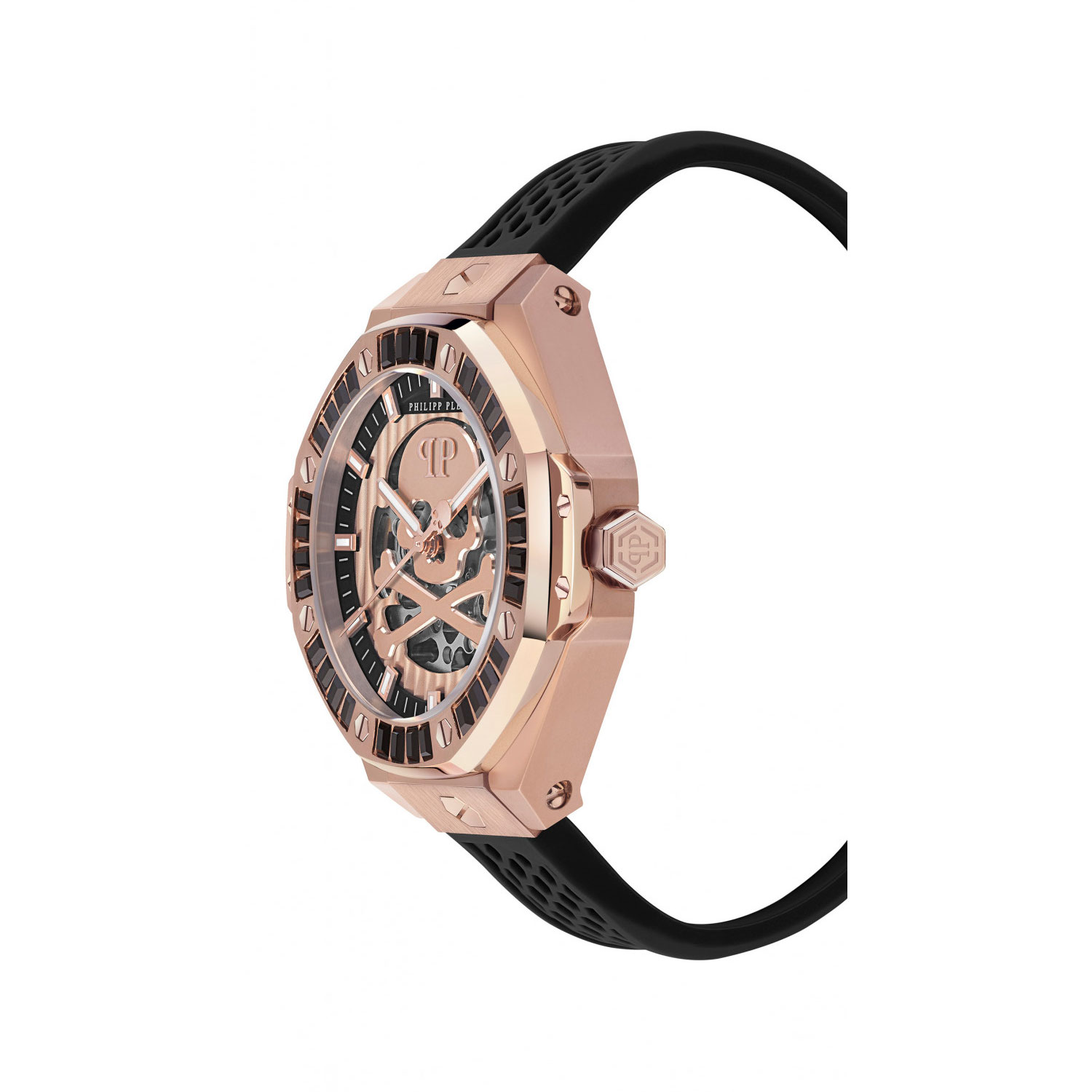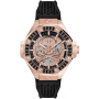 Мужские механические часы с автоподзаводом. Калибр механизма Seiko TMI NH70 на 24х камнях. Центральные часовая, минутная и секундная стрелки. Скелетонизированный золотистый циферблат с фирменным изображением черепа. Корпус выполнен из нержавеющей стали с IP покрытием цвета розового золота и декорирован черными кристаллами по безелю. Диаметр корпуса составляет 46 мм, толщина 13,5 мм. Черный силиконовый ремешок с перфорацией шириной 23 мм, стандартная застежка. Прочное минеральное стекло устойчивое к мелким механическим повреждениям. Прозрачная задняя крышка. Водостойкость WR 50 (мытье рук, дождь).