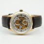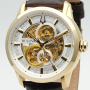 Мужские механические часы с автоподзаводом. Часы, минуты, секунды. Скелетонизированный циферблат. Корпус выполнен из нержавеющей стали с IP покрытием цвета желтого золота. Диаметр корпуса 43 мм. Кожаный ремешок. Выпуклое минеральное стекло. Прозрачная задняя крышка. Водостойкость WR 30.