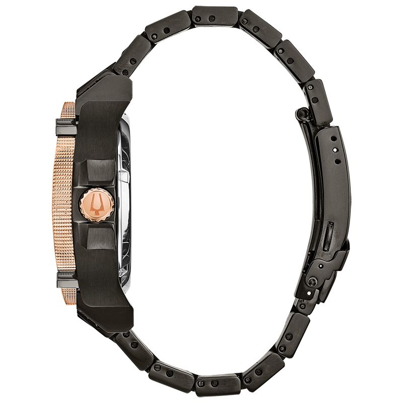 Кварцевые часы с частотой колебаний 262 кГц, что превышает стандарт в 8 раз, для высокой точности. Часы, минуты, секунды, дата. Корпус выполнен из нержавеющей стали с IP покрытием. Изогнутое минеральное стекло. Черно-серый текстурированный циферблат с бриллиантами на месте меток. Защитная заводная головка. Стальной браслет с IP покрытием.