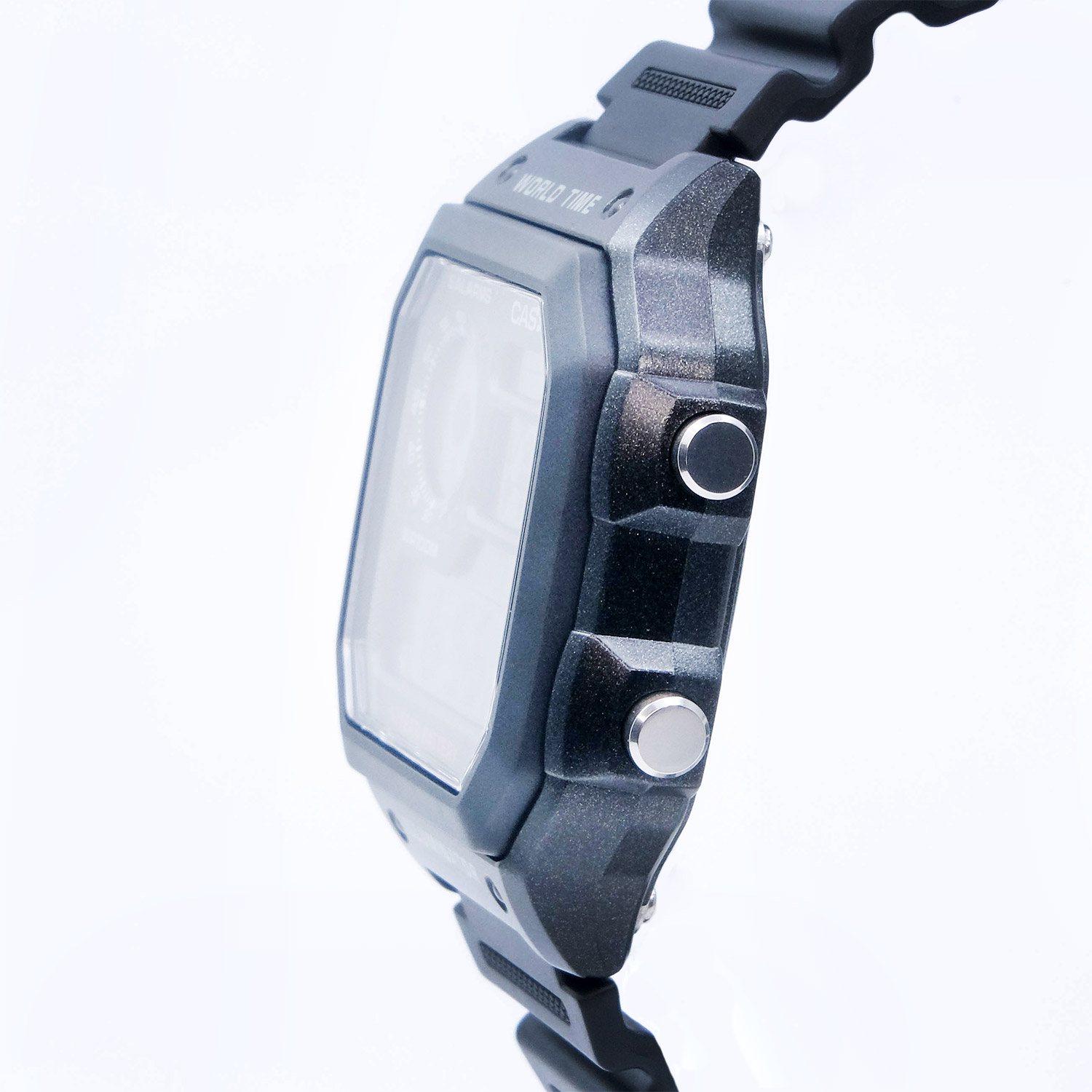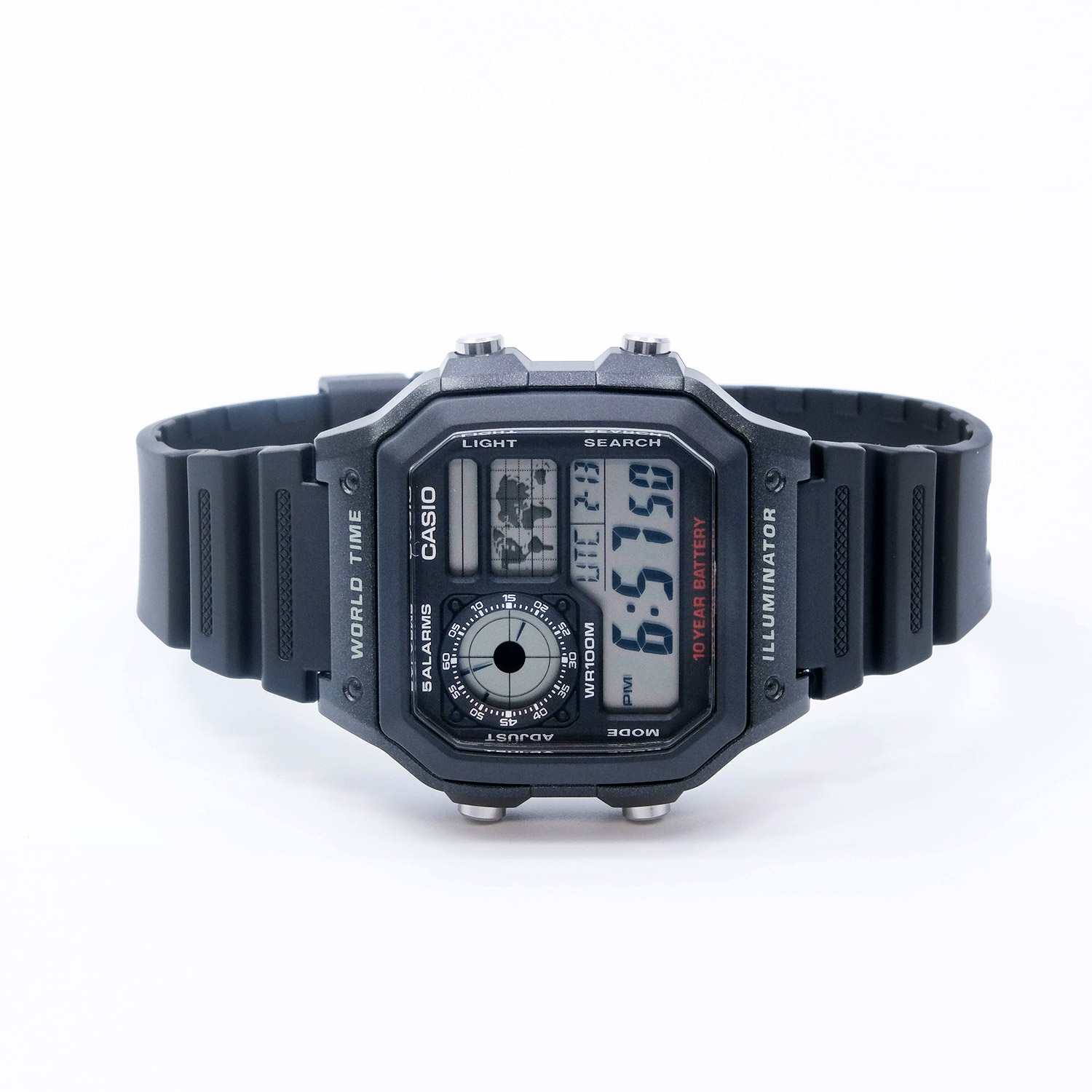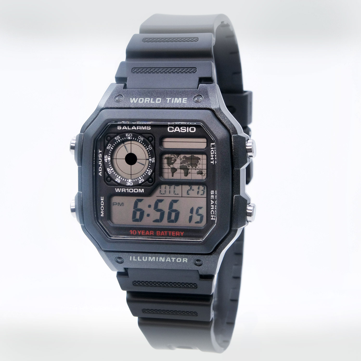 Светодиодная подсветка. Мировое время - показание текущего времени в 31 временной зоне - 48 городов. Максимальное время непрерывной работы секундомера 24 часа, шаг измерения 1/100. Таймер - секундомер обратного отсчета, при окончании отсчета установленного промежутка времени издается сигнал, максимальное время установки 24 часа, шаг отсчета 10 секунд. Возможность установки 5 вариантов будильника в том числе с указанием даты и дня недели. Срок работы батарейки рассчитан на 10 лет. 12/24 формат времени. Размер корпуса 45 х 42,1 мм, толщина 12,5 мм.
