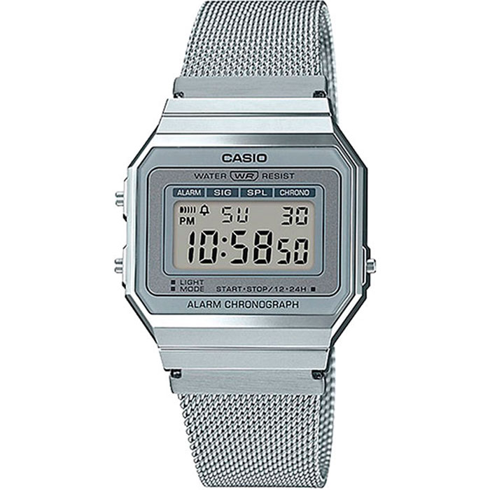 Электронные часы. Водостойкость WR 30. Светодиодная подсветка. Секундомер 1/100. Автоматический календарь. Будильник. Ежечасный сигнал. 12/24х часовой формат времени. Корпус выполнен из полимерного материала. Размеры корпуса 36 мм х 37 мм толщина 6 мм. Устойчивое к мелким механическим повреждениям минеральное стекло. Браслет миланского плетения, выполнен из нержавеющей стали. Раскладывающаяся застежка. Срок службы батареи: 3 года. Вес 53г.