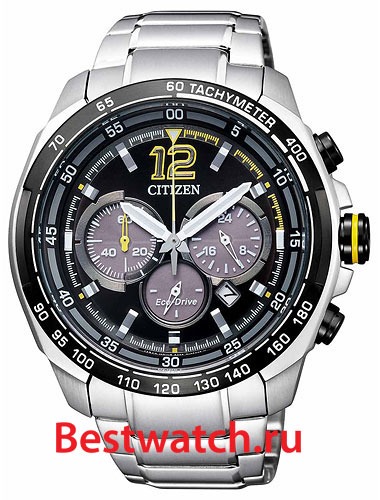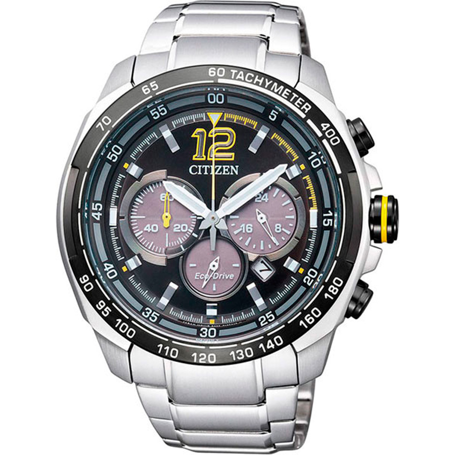 Кварцевый хронограф. Калибр B 620. 12/24 часовой формат времени. Индикатор числа. Секундомер. Тахиметр. Система Eco-Drive не требующая замены батарейки. Питание от солнечной энергии, запас энергии на 270 дней. Функция индикации заряда (EOL). Люминесцентные стрелки. Корпус из нержавеющей стали с частичным IP покрытием. Минеральное стекло. Браслет из нержавеющей стали. Диаметр 45 мм.