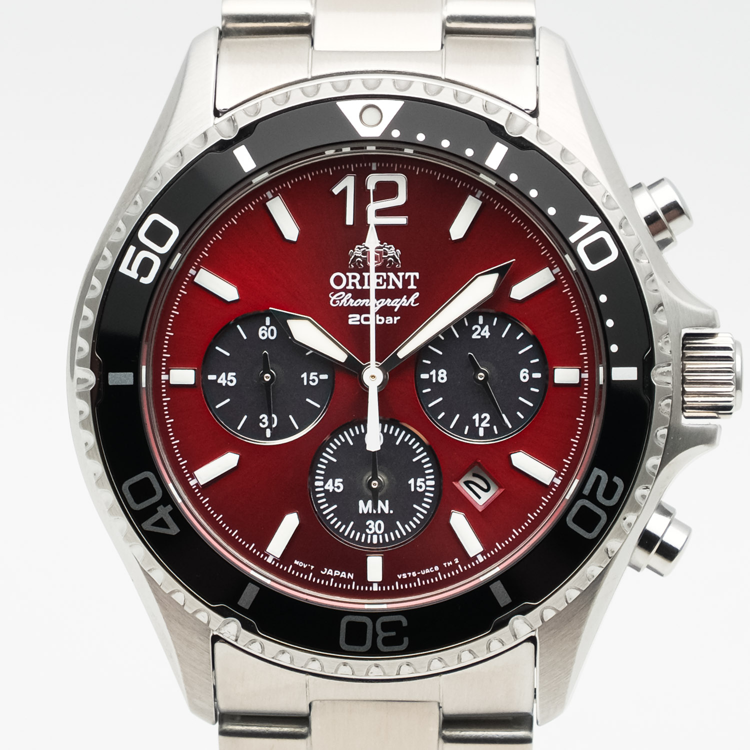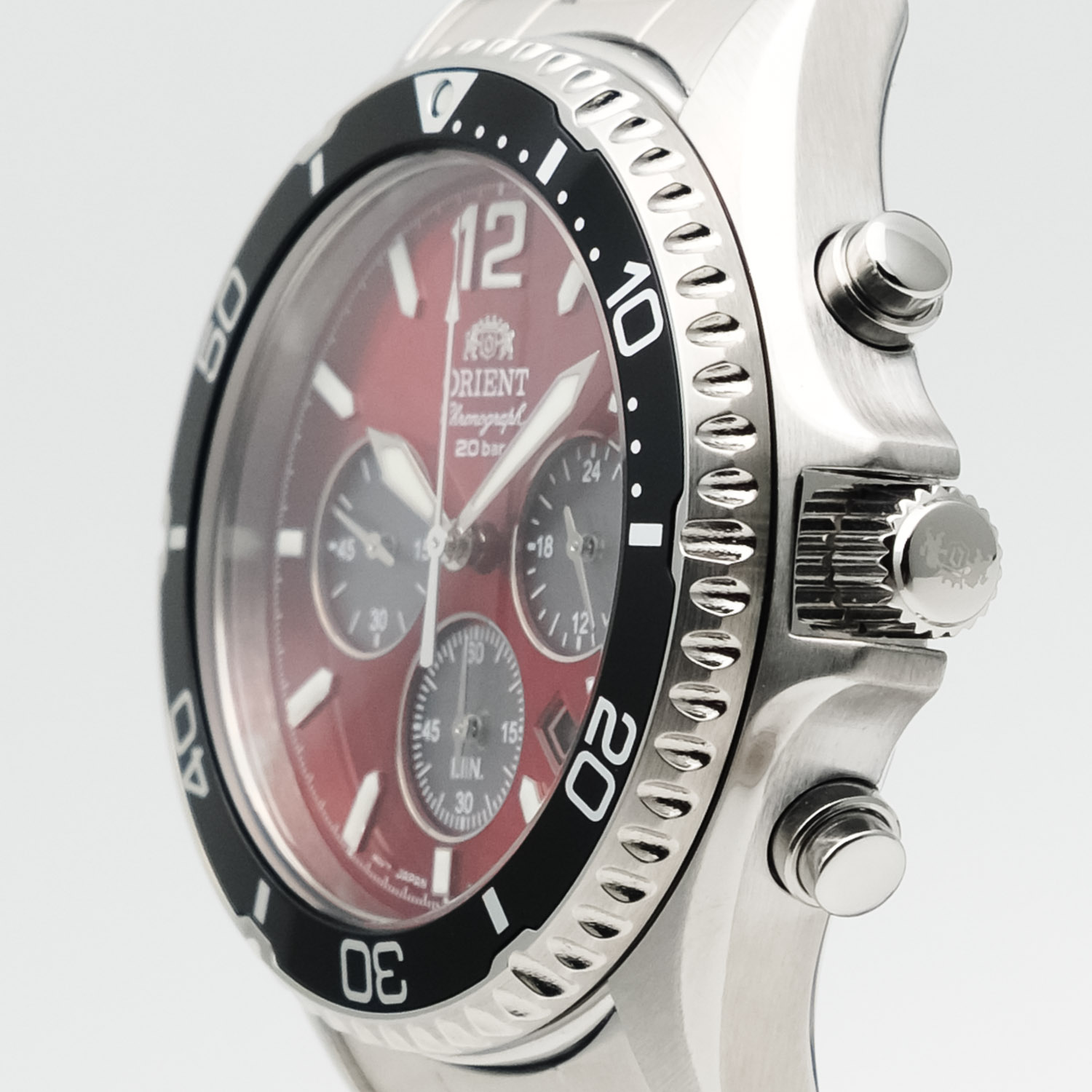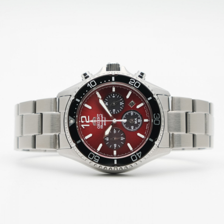 Мужской кварцевый хронограф на солнечной батарее. Калибр механизма VS752. Центральные часовая и минутная стрелки, секундная стрелка вынесена на малый циферблат. Апертура даты между 4 и 5 часами. 12/24х часовой формат времени. Секундомер. Красный циферблат. Круглый корпус выполнен из нержавеющей стали. Диаметр корпуса составляет 42,8 мм. Однонаправленный безель. Стальной браслет, раскладывающаяся застежка. Устойчивое к возникновению царапин сапфировое стекло. Водостойкость WR 200 (погружение с аквалангом).