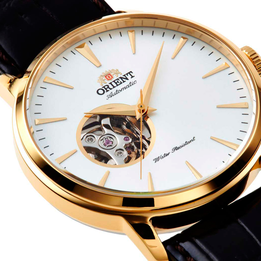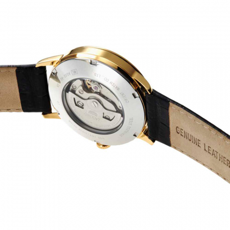 Механические часы с автоподзаводом. Возможность ручного завода. Функция остановки секундной стрелки. Открытый баланс хода. Водостойкость WR 50. Корпус выполнен из нержавеющей стали с PVD покрытием. Диаметр корпуса 41 мм, толщина 11.9 мм. Кожаный ремешок.