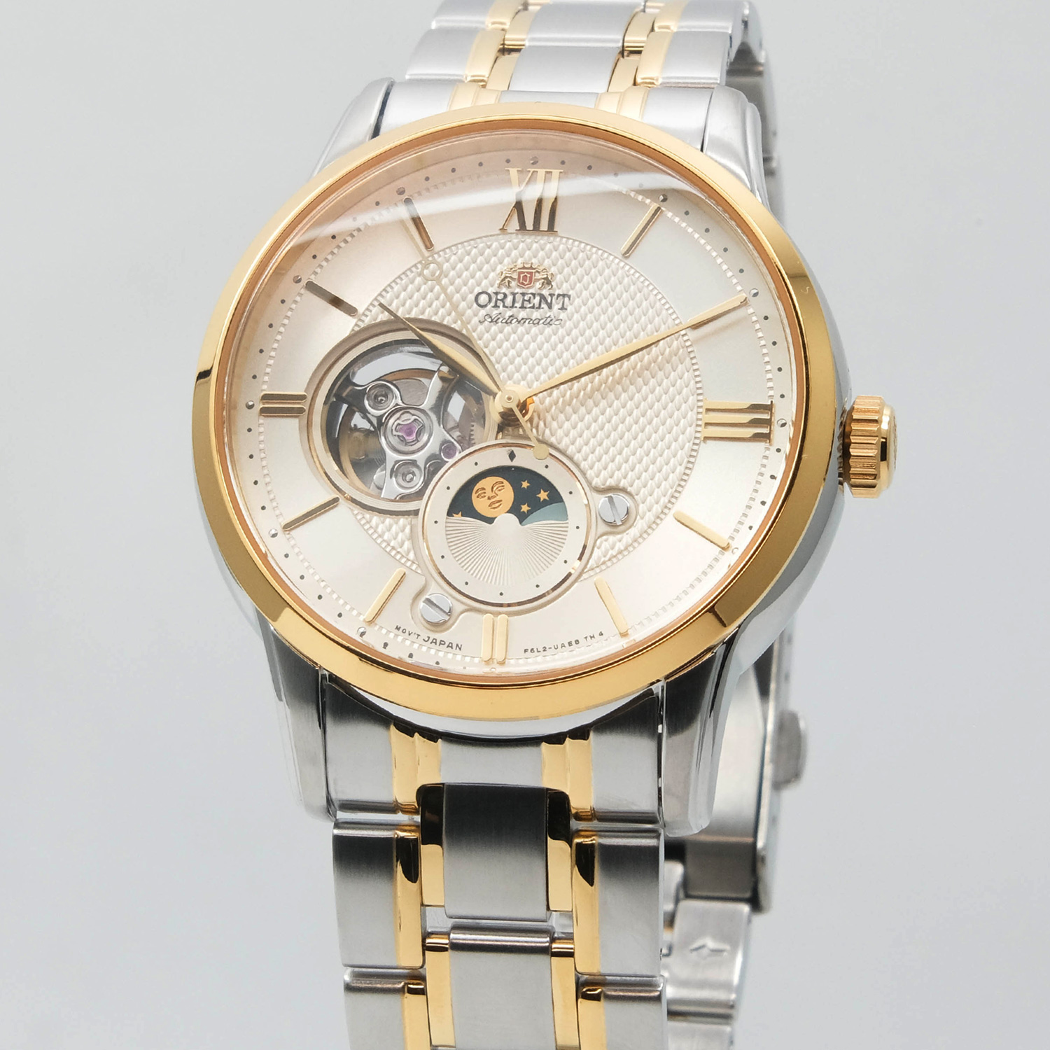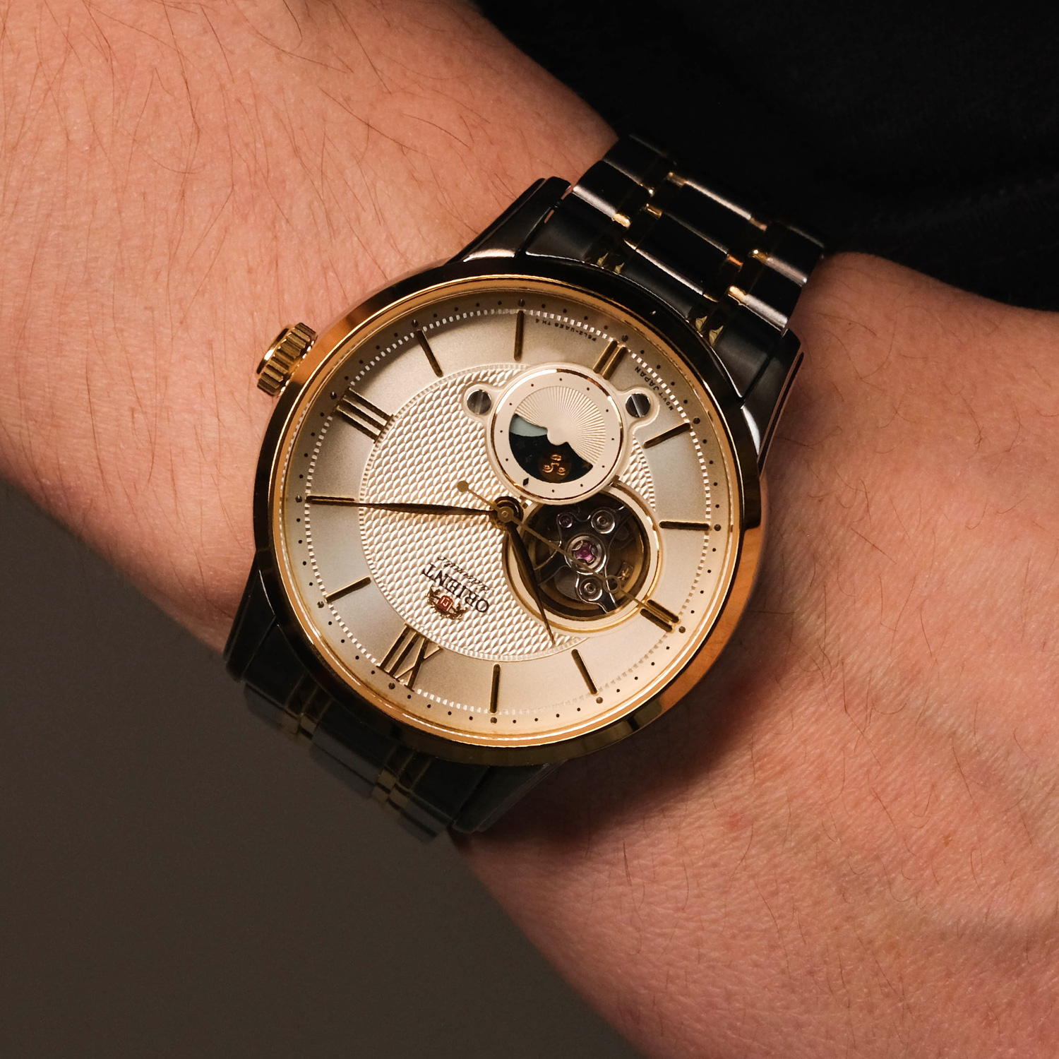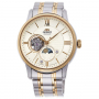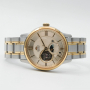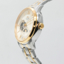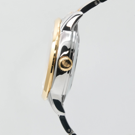 Мужские механические часы с автоподзаводом. Возможность ручного завода. Запас хода 40 часов. Центральные часовая, минутная и секундная стрелки. Кремовый циферблат с открытым балансом хода. Индикация день/ночь. Круглый корпус выполнен из нержавеющей стали с частичным PVD покрытием цвета желтого золота. Диаметр корпуса составляет 42 мм, толщина 13 мм. Стальной браслет с частичным покрытием, раскладывающаяся застежка. Устойчивое к возникновению царапин сапфировое стекло. Прозрачная задняя крышка. Водостойкость WR 50 (мытье рук, дождь).