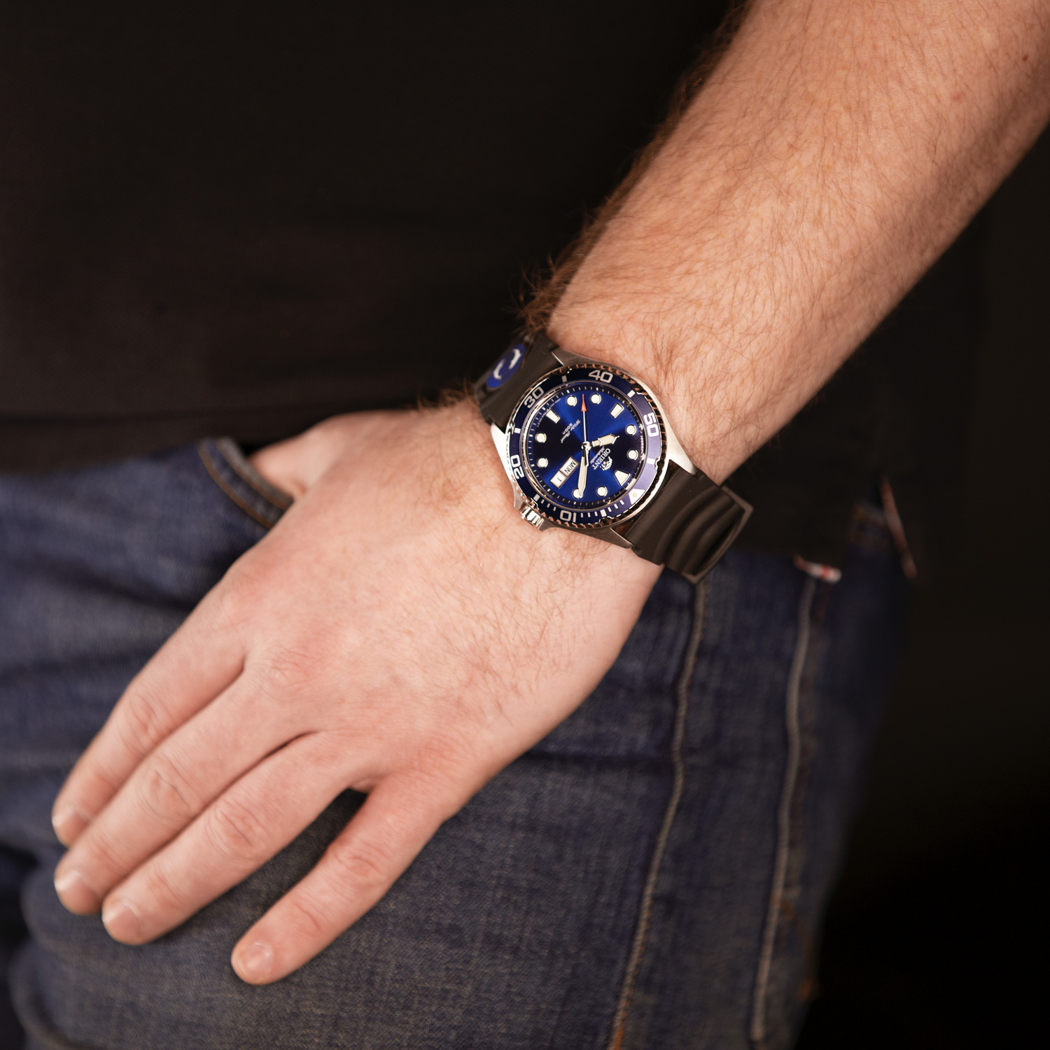Механические часы с автоподзаводом. Возможность ручного завода. Функция остановки секундной стрелки. Водостойкость WR 200. Индикация числа и дня недели. Люминесцентное покрытие на стрелках. Каучуковый ремешок. Диаметр корпуса 42 мм, толщина 13 мм.