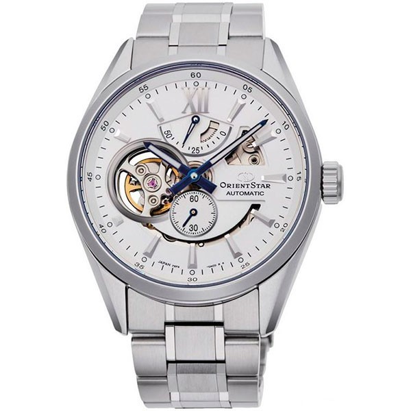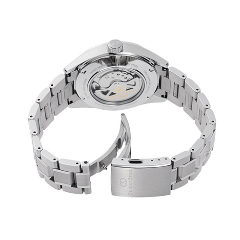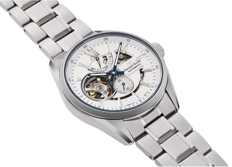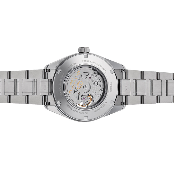 Мужские механические часы с автоподзаводом. Калибр механизма F6F44 на 24 камнях. Частота 21 600 полуколебаний в час. Запас хода 50 часов. Центральные часовая и минутная стрелки, секундная стрелка вынесена на малый циферблат в позиции 6 часов. Ретроградный указатель запаса хода. Серебристый циферблат с открытым балансом хода. Круглый корпус выполнен из матовой нержавеющей стали. Диаметр корпуса составляет 41 мм. Стальной браслет, раскладывающаяся застежка. Устойчивое к возникновению царапин сапфировое стекло с антибликовым покрытием. Прозрачная задняя крышка. Водостойкость WR 100 (плавание без погружения).