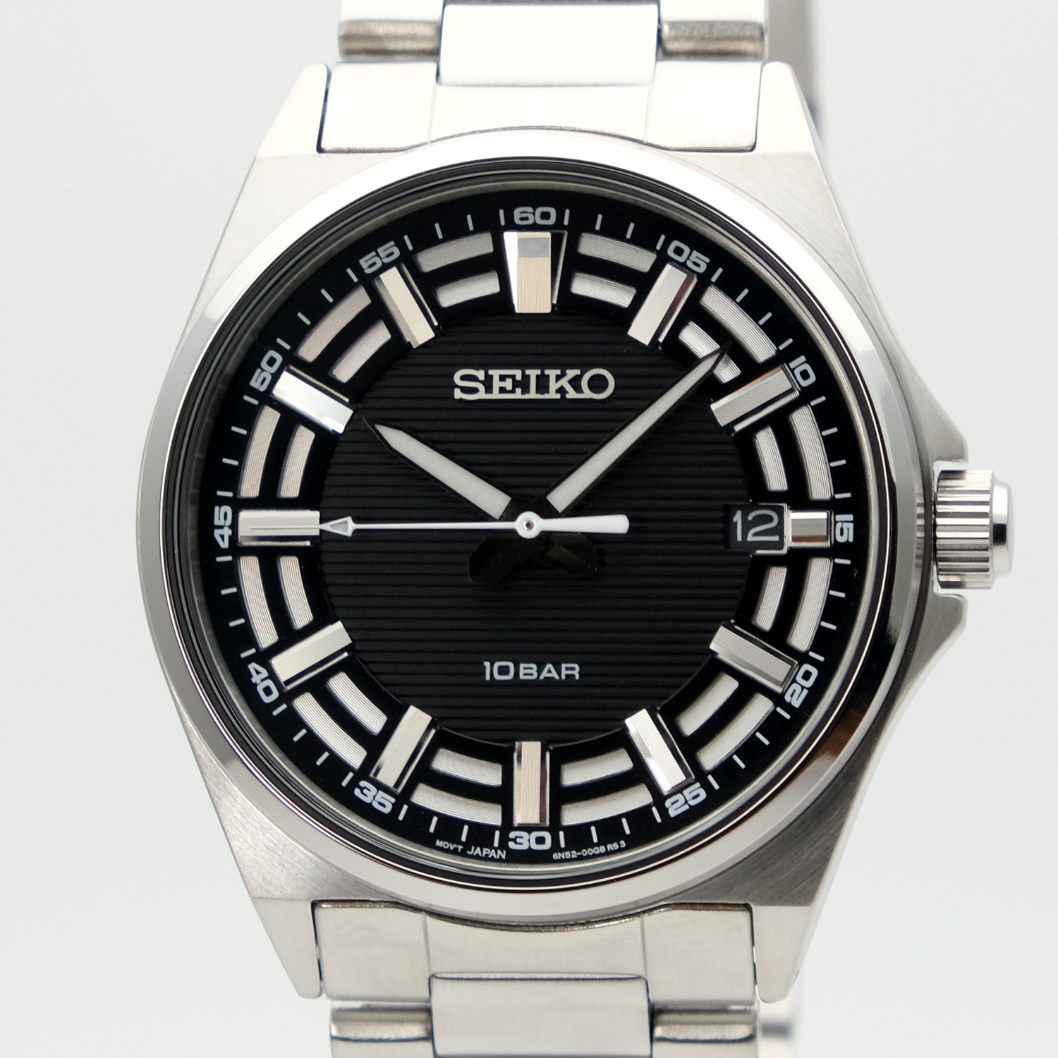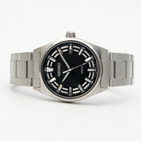 Мужские кварцевые часы. Калибр механизма 6N52. Центральные часовая, минутная и секундная стрелки. Апертура даты в позиции 3 часов. Черный циферблат. Круглый корпус выполнен из нержавеющей стали. Диаметр корпуса составляет 40 мм, толщина 9,8 мм. Заводная головка с защитой. Стальной браслет, тройная раскладывающаяся застежка. Закаленное минеральное стекло Hardlex устойчивое к мелким механическим повреждениям. Водостойкость WR 100 (плавание без погружения). Вес примерно 135 гр.