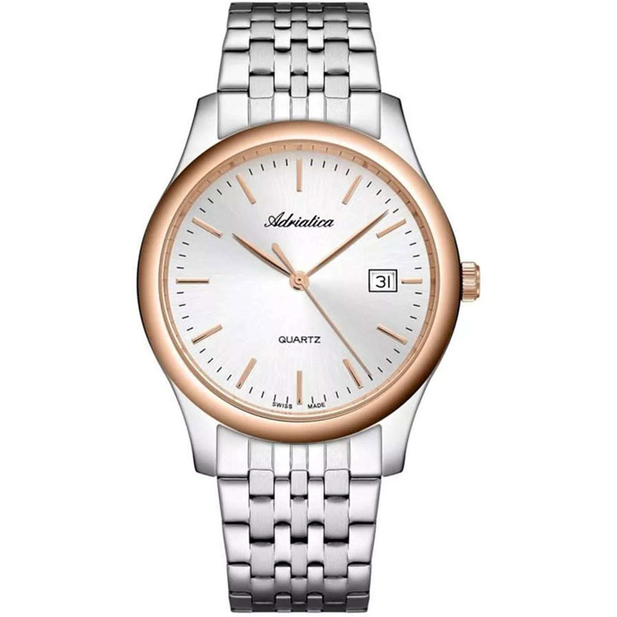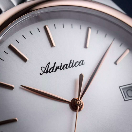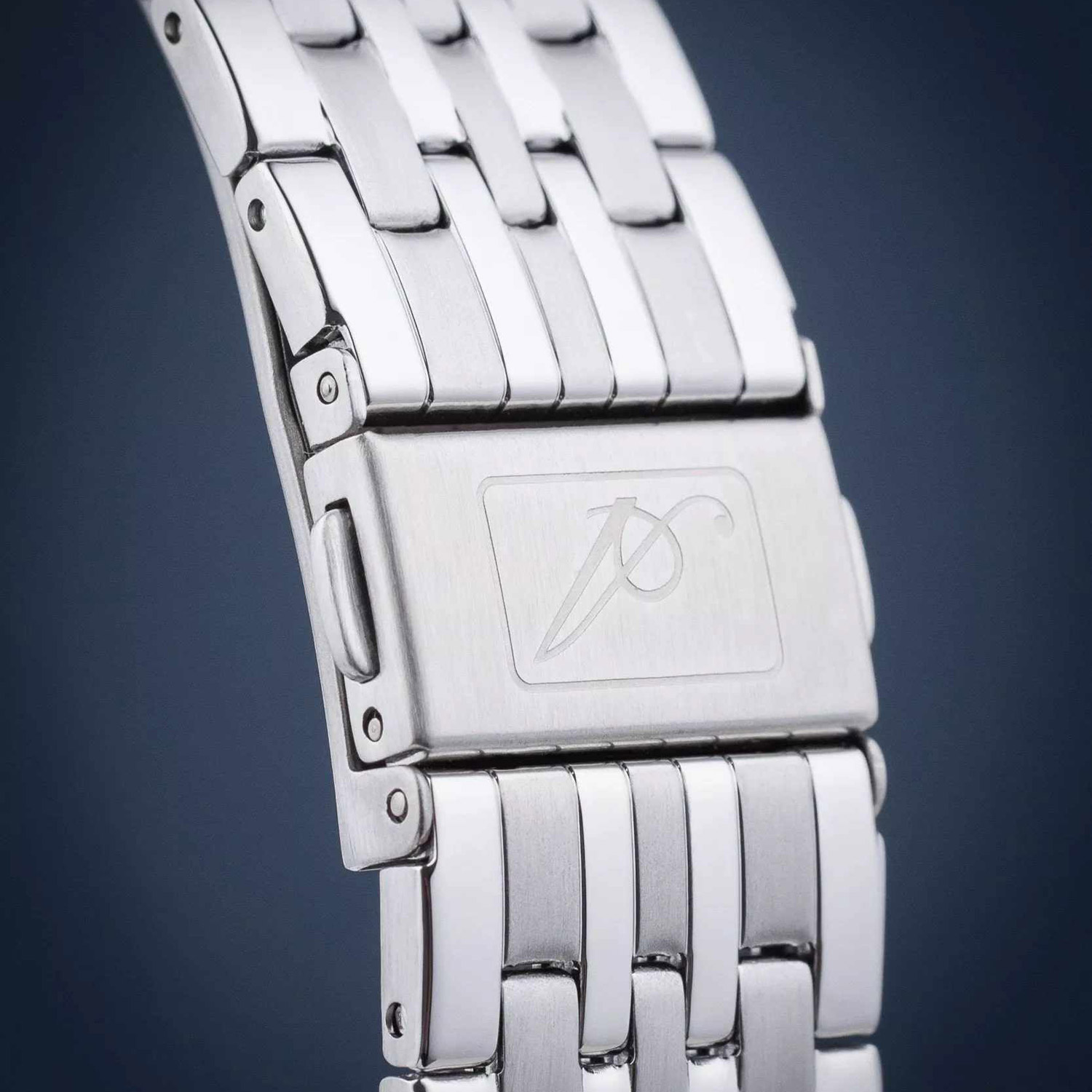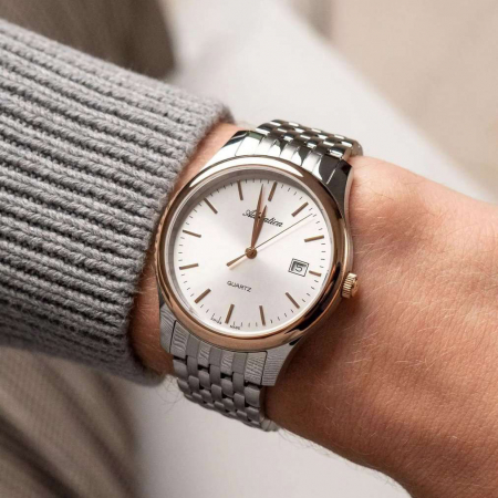Кварцевые часы. Водостойкость WR 50 (мытье рук, дождь). Часы, минуты, секунды. Индикация даты. Циферблат с часовыми индексами в виде штрихов. Корпус выполнен из нержавеющей стали. Диаметр корпуса 40 мм, толщина 8 мм. Устойчивое к возникновению мелких механических повреждений сапфировое стекло. Браслет выполнен из нержавеющей стали.
