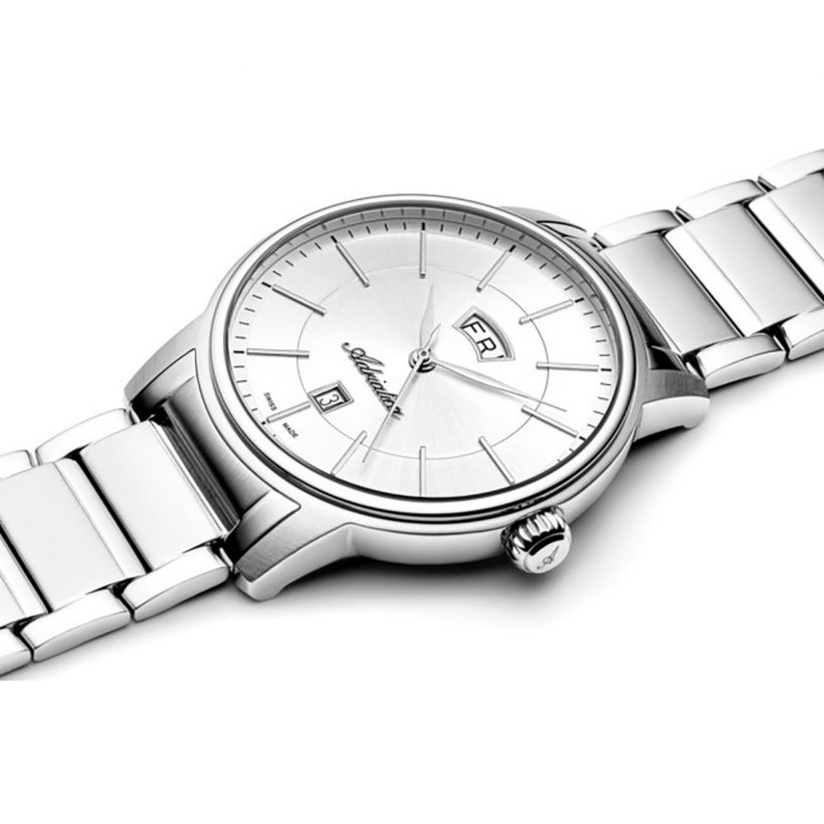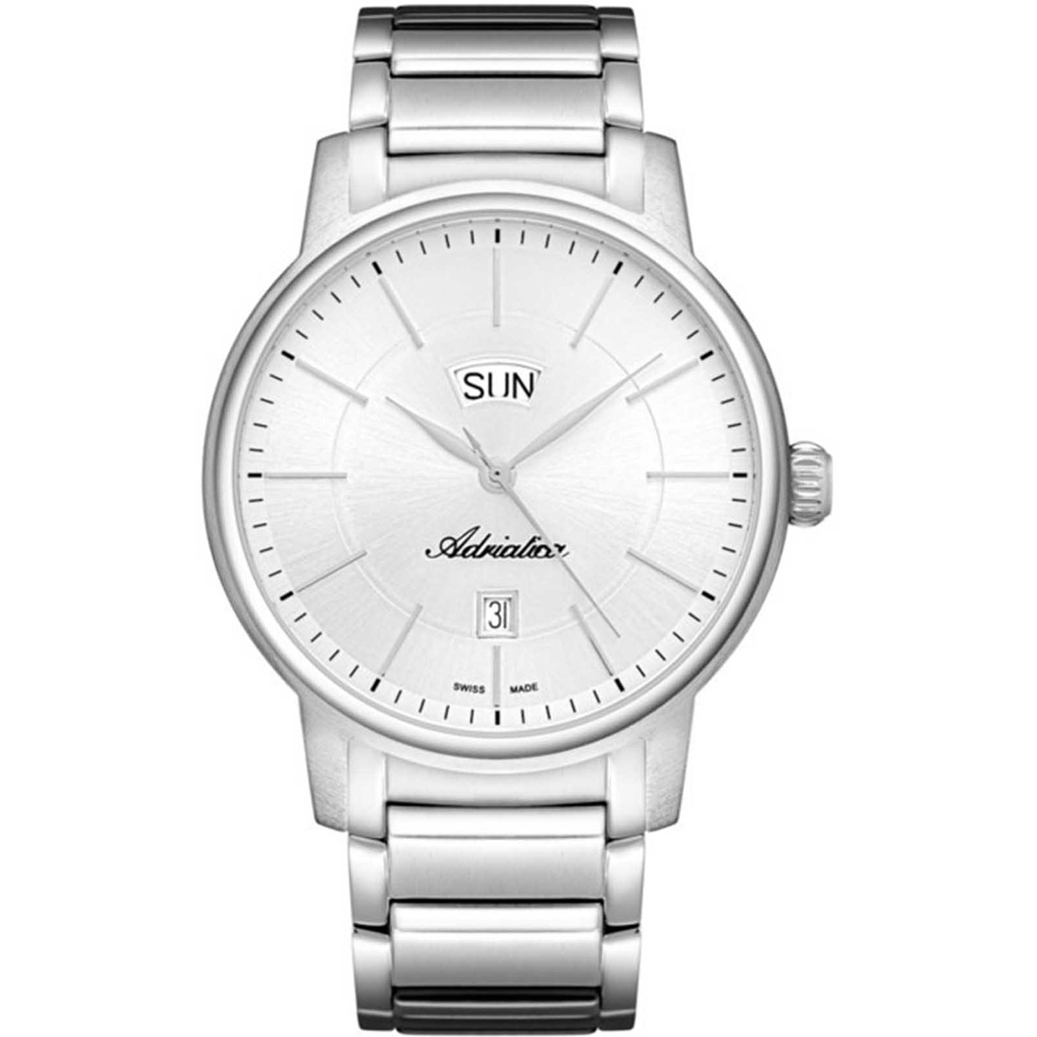 Механизм Ronda 517. Индикация числа и дня недели. Корпус и браслет часов выполнены из нержавеющей стали.