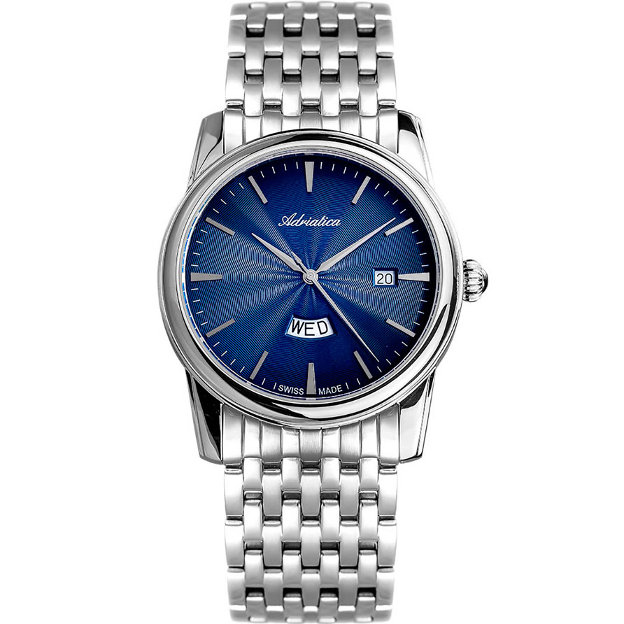 Кварцевые часы. Водостойкость WR 50. Центральные часовая, минутная и секундная стрелки. Индикация даты и дня недели. Синий циферблат с часовыми индексами в виде штрихов. Корпус выполнен из нержавеющей стали. Диаметр корпуса 42 мм, толщина 10 мм. Устойчивое к возникновению мелких механических повреждений минеральное стекло. Браслет выполнен из нержавеющей стали.