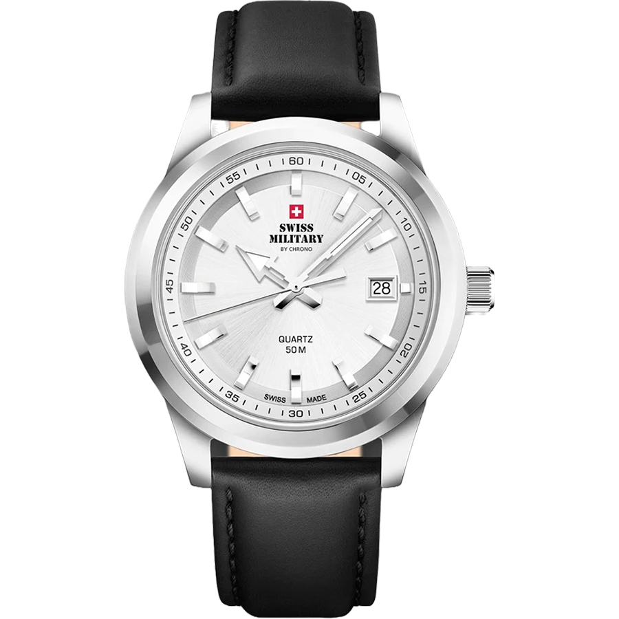 Кварцевые часы. Водостойкость WR 50. Центральные часовая, минутная и секундная стрелки. Индикация даты. Серебристый циферблат с часовыми индексами в виде штрихов. Корпус выполнен из нержавеющей стали. Диаметр корпуса 41 мм. Устойчивое к возникновению мелких механических повреждений минеральное стекло. Кожаный ремешок черного цвета.