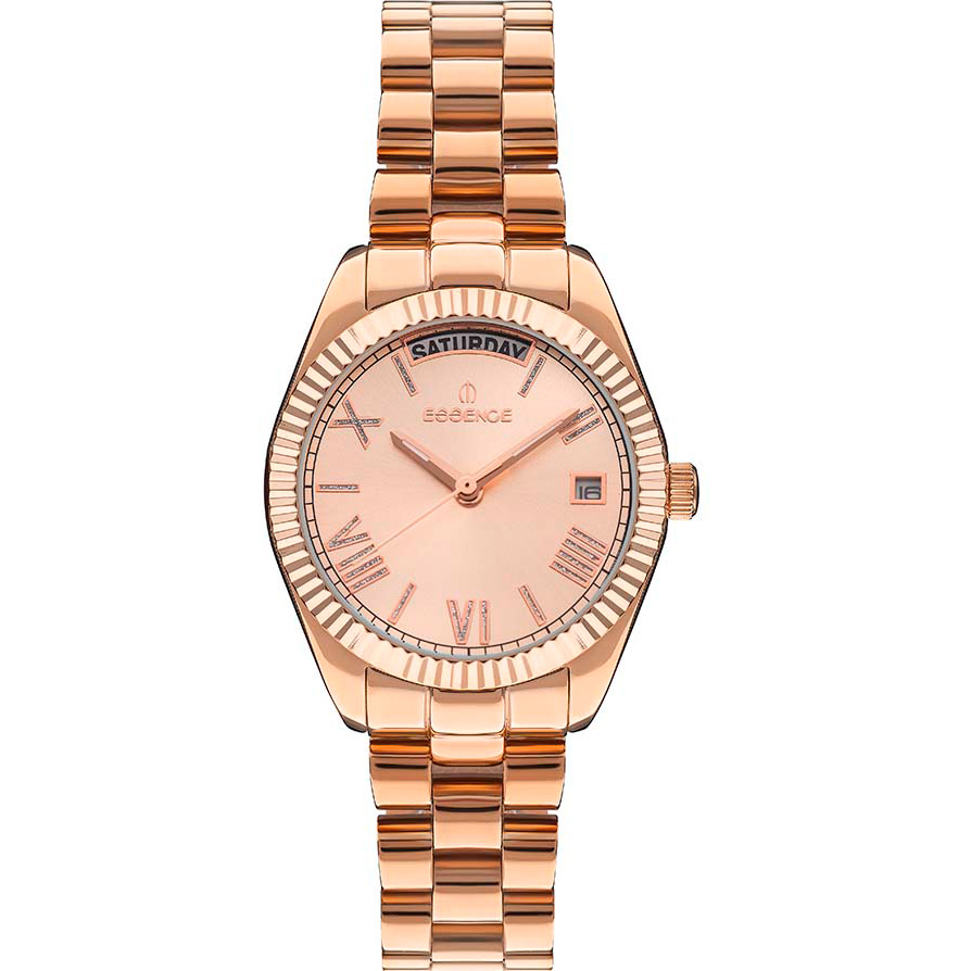 Кварцевые часы. Водостойкость WR 30. Центральные часовая, минутная и секундная стрелки. Индикация даты и дня недели. Золотистый циферблат с часовыми индексами в виде штрихов и цифр. Корпус выполнен из нержавеющей стали с IP покрытием. Диаметр корпуса 30 мм, толщина 11 мм. Устойчивое к возникновению мелких механических повреждений минеральное стекло. Браслет выполнен из нержавеющей стали с IP покрытием.
