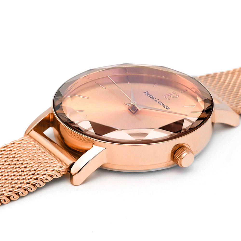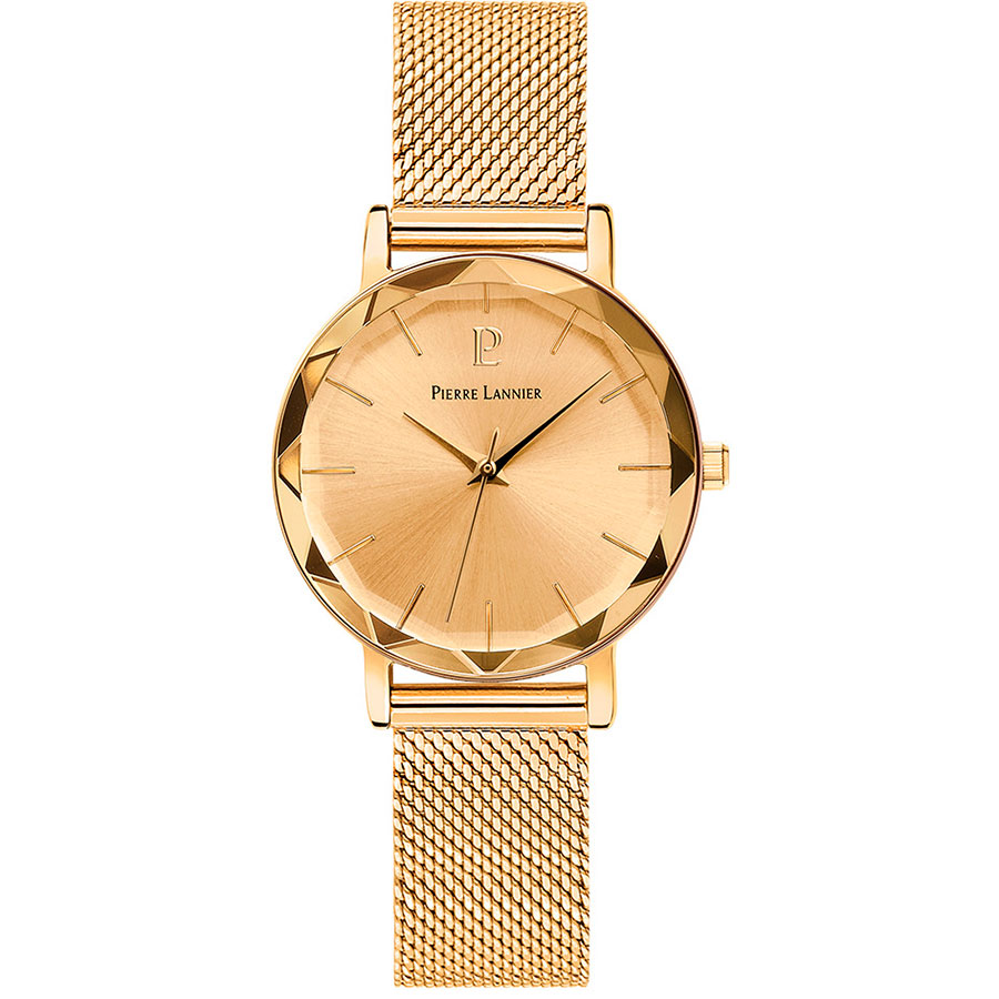 Женские кварцевые часы. Центральные часовая, минутная и секундная стрелки. Золотистый циферблат. Круглый корпус выполнен из нержавеющей стали с IP покрытием цвета желтого золота. Диаметр корпуса составляет 30 мм, толщина 7,3 мм. Стальной браслет с покрытием выполнен в технике миланского плетения, ширина 14 мм, раскладная застежка. Фасетчатое минеральное стекло устойчивое к мелким механическим повреждениям. Водостойкость WR 50 (мытье рук, дождь).