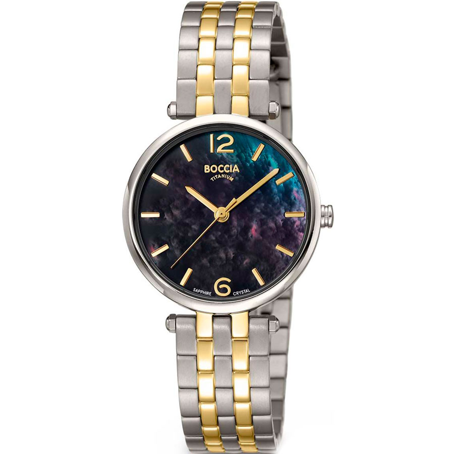 Кварцевые часы. Водостойкость WR 50. Центральные часовая, минутная и секундная стрелки. Перламутровый циферблат с часовыми индексами в виде штрихов и цифр. Корпус выполнен из титана. Диаметр корпуса 30 мм, толщина 6 мм. Устойчивое к возникновению мелких механических повреждений сапфировое стекло. Браслет выполнен из титана с частичным PVD покрытием.