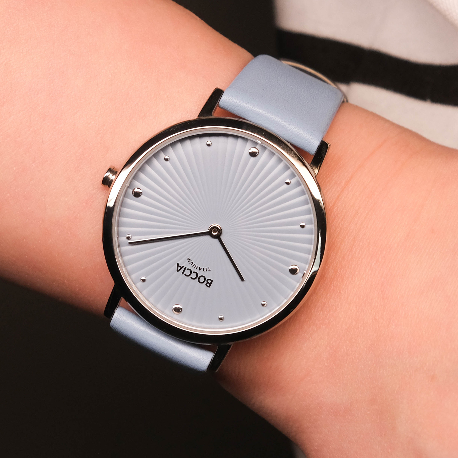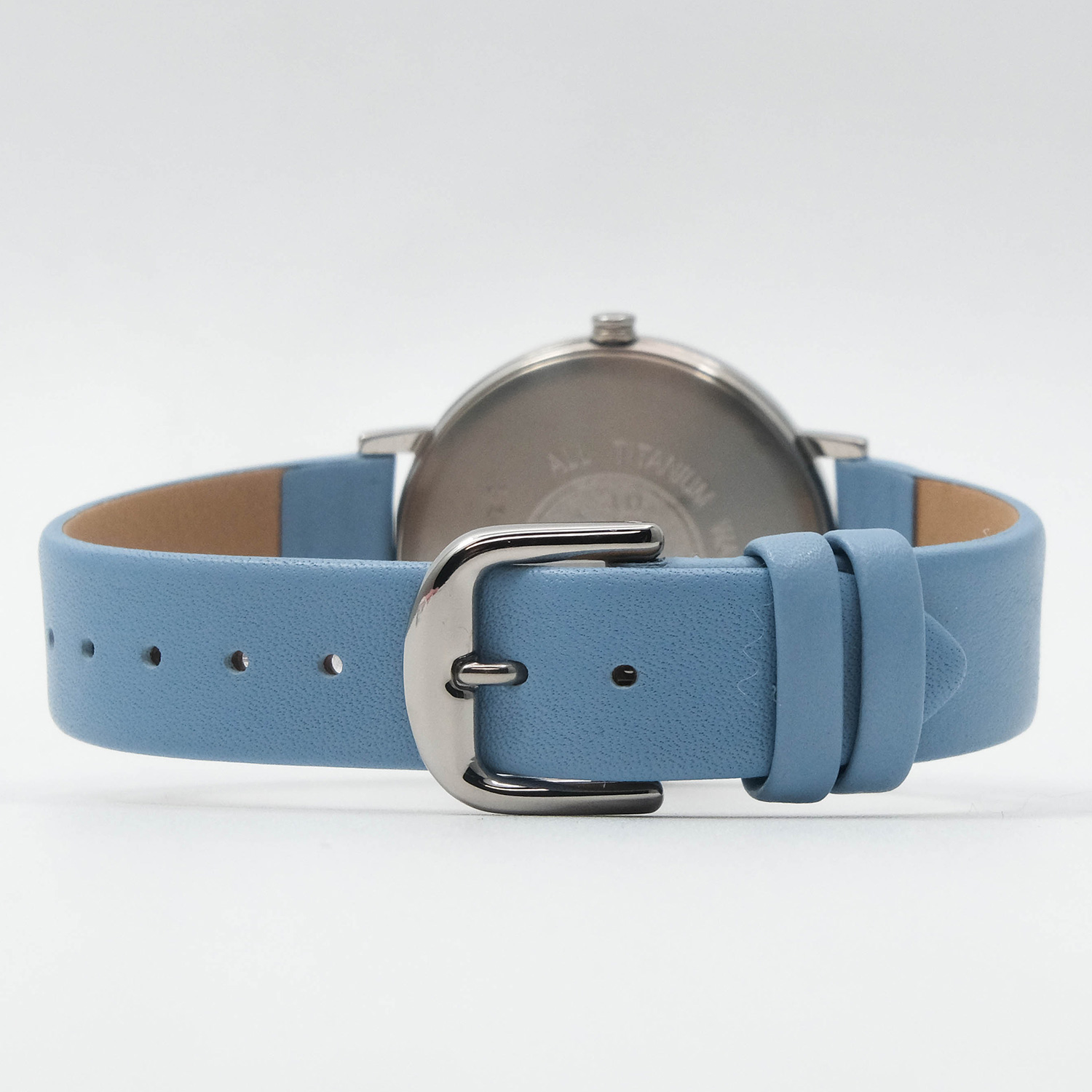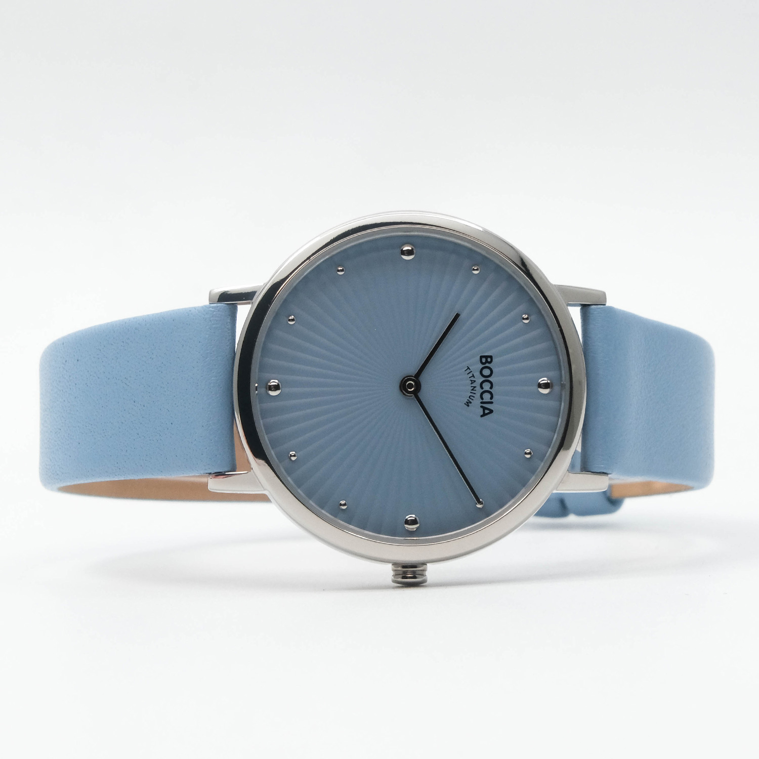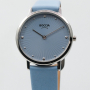 Женские кварцевые часы. Калибр механизма Miyota GL22. Центральные часовая и минутная стрелки. Голубой циферблат. Круглый корпус выполнен из суперлегкого титана. Диаметр корпуса составляет 34 мм. Голубой кожаный ремешок, стандартная застежка. Прочное минеральное стекло устойчивое к мелким механическим повреждениям. Водостойкость WR 50 (мытье рук, дождь).