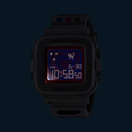 Электронные часы. Подсветка. Функция пиксельной анимации. Секундомер. Функция мирового времени. 12/24х часовой формат времени. Будильник. Автоматический календарь. Включение/выключение звука кнопок. Противоударный корпус выполнен из полимерного материала. Размеры корпуса 39 мм x 43 мм x 15 мм. Ремешок выполнен из полимерного материала. Прочное минеральное стекло устойчивое к мелким механическим повреждениям. Водостойкость WR 100 (плавание без погружения). В комплекте брелок, с возможностью менять верхнюю часть корпуса, обновляя внешний вид часов. Срок службы батареи: 3 года.
