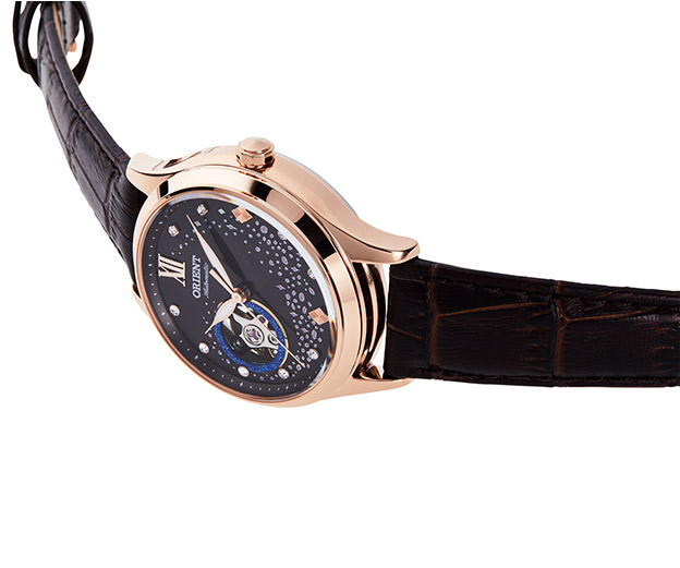 Механические часы с автоподзаводом. Открытый баланс хода. Водостойкость WR 30. Часы, минуты, секунды. Корпус выполнен из нержавеющей стали с PVD покрытием. Диаметр корпуса 36 мм , толщина 13 мм. Минеральное стекло. Кожаный ремешок. Часы украшены кристаллами.