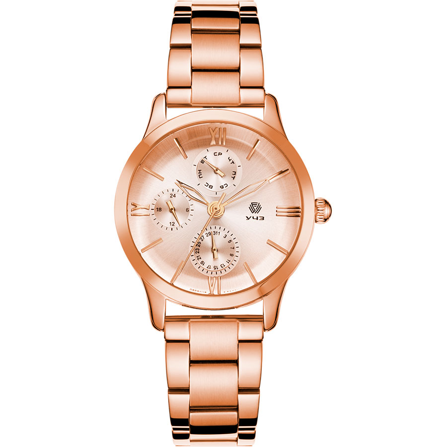 Женские кварцевые часы. Центральные часовая, минутная и секундная стрелки. 12/24х часовой формат времени. Отображение даты и дня недели в малых циферблатах. Розовый циферблат. Круглый корпус выполнен из нержавеющей стали с IP покрытием цвета розового золота. Диаметр корпуса составляет 33 мм. Стальной браслет с покрытием, раскладывающаяся застежка. Прочное минеральное стекло устойчивое к мелким механическим повреждениям. Водостойкость WR 30 (брызги).