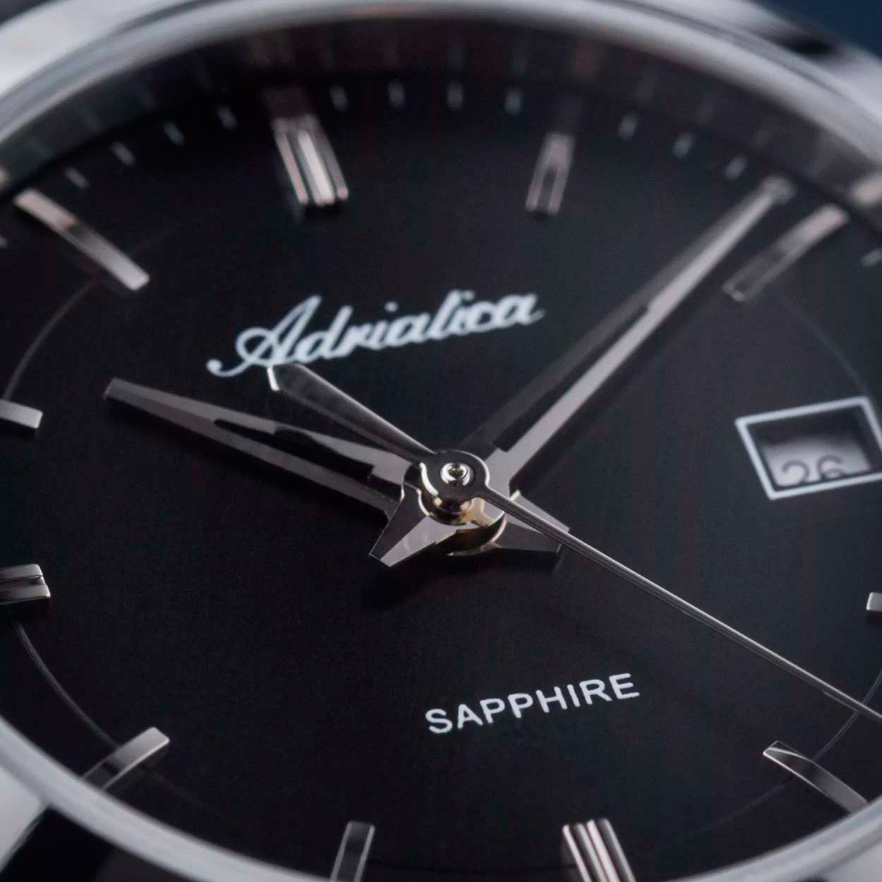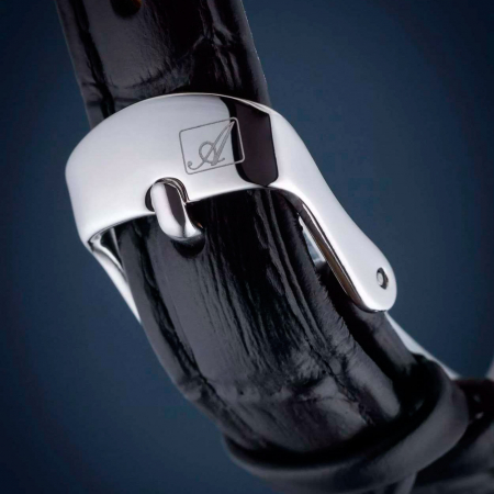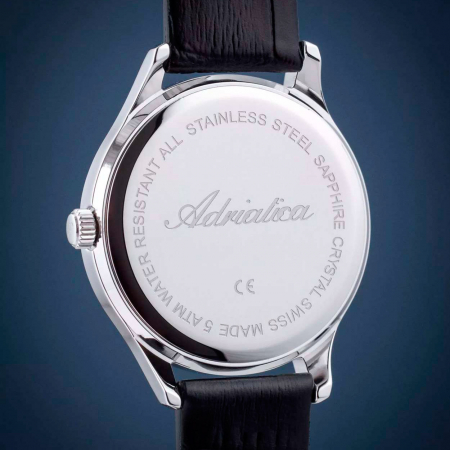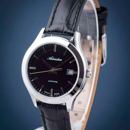 Кварцевые часы. Водостойкость WR 50 (мытье рук, дождь). Часы, минуты, секунды. Индикация даты. Циферблат с часовыми индексами в виде штрихов. Корпус выполнен из нержавеющей стали. Диаметр корпуса 30 мм, толщина 8 мм. Устойчивое к возникновению мелких механических повреждений сапфировое стекло. Кожаный ремешок черного цвета.