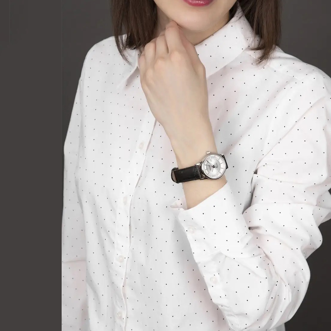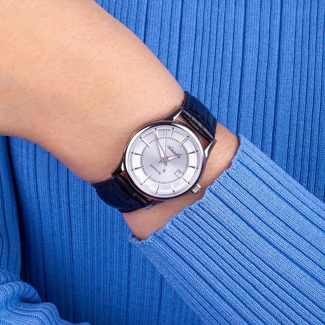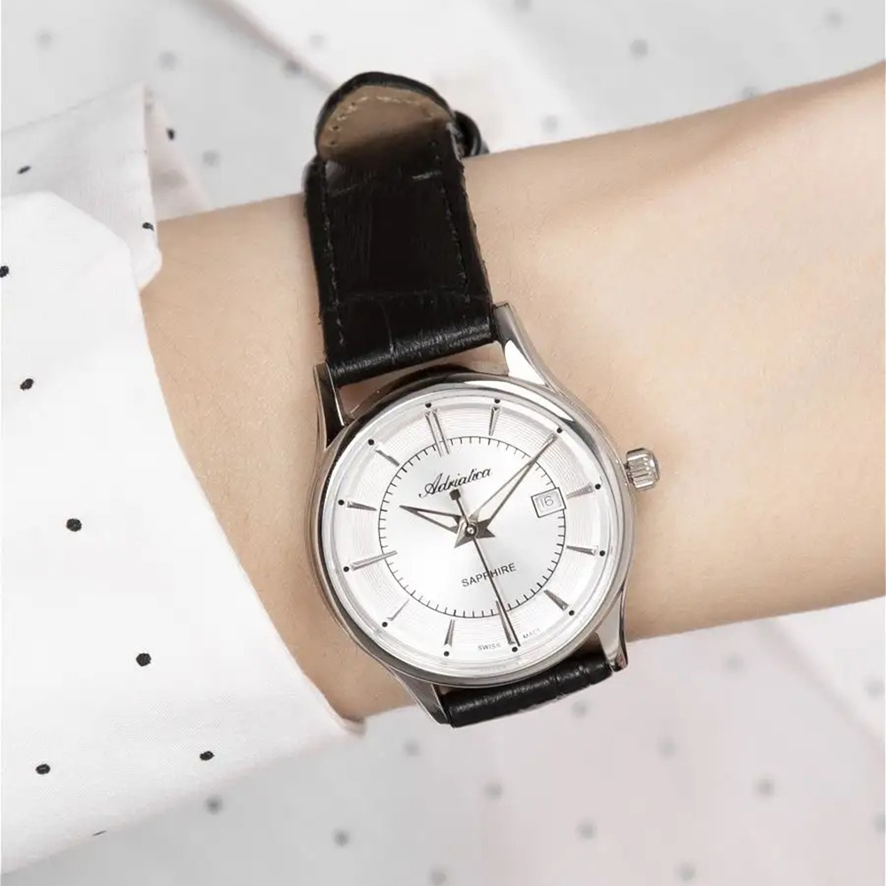 Женские кварцевые часы. Калибр механизма Ronda 715. Центральные часовая, минутная и секундная стрелки. Апертура даты в позиции 3 часов. Серебристый циферблат. Люминесцентные стрелки. Круглый корпус выполнен из нержавеющей стали. Диаметр корпуса составляет 31 мм, толщина 7 мм. Черный кожаный ремешок, стандартная застежка. Устойчивое к возникновению царапин сапфировое стекло. Водостойкость WR 50 (мытье рук, дождь). Вес 30 гр.