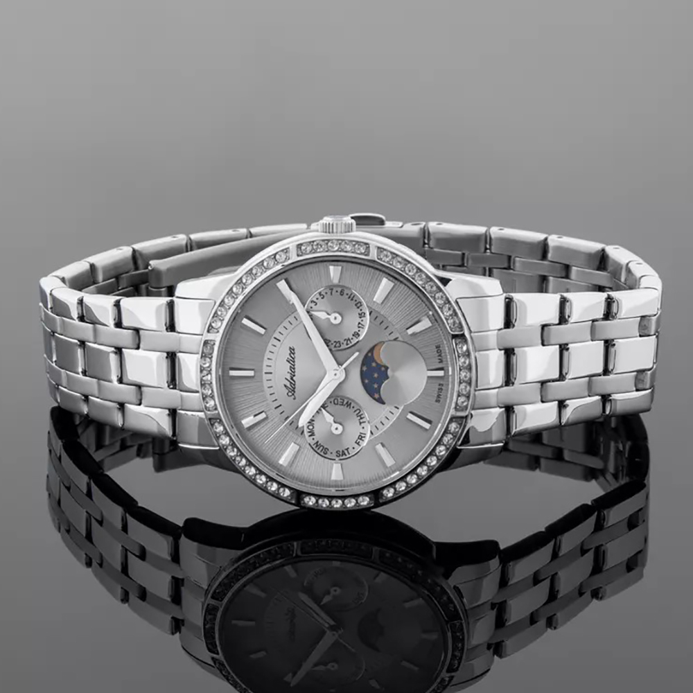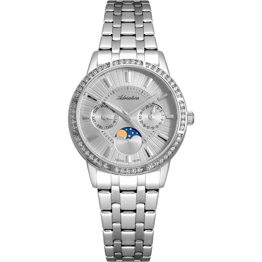 Кварцевые часы. Водостойкость WR 50 (мытье рук, дождь). Центральные часовая, минутная и секундная стрелки. Индикация даты и дня недели. Фазы Луны. Циферблат с часовыми индексами в виде штрихов. Корпус выполнен из нержавеющей стали. Диаметр корпуса 34 мм, толщина 9 мм. Устойчивое к возникновению мелких механических повреждений сапфировое стекло. Браслет выполнен из нержавеющей стали. Часы украшены фианитами.