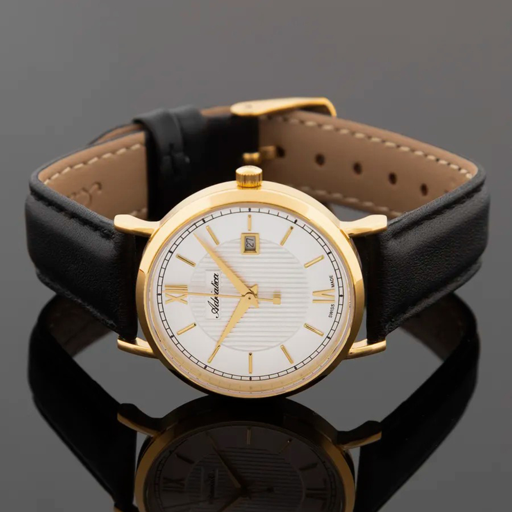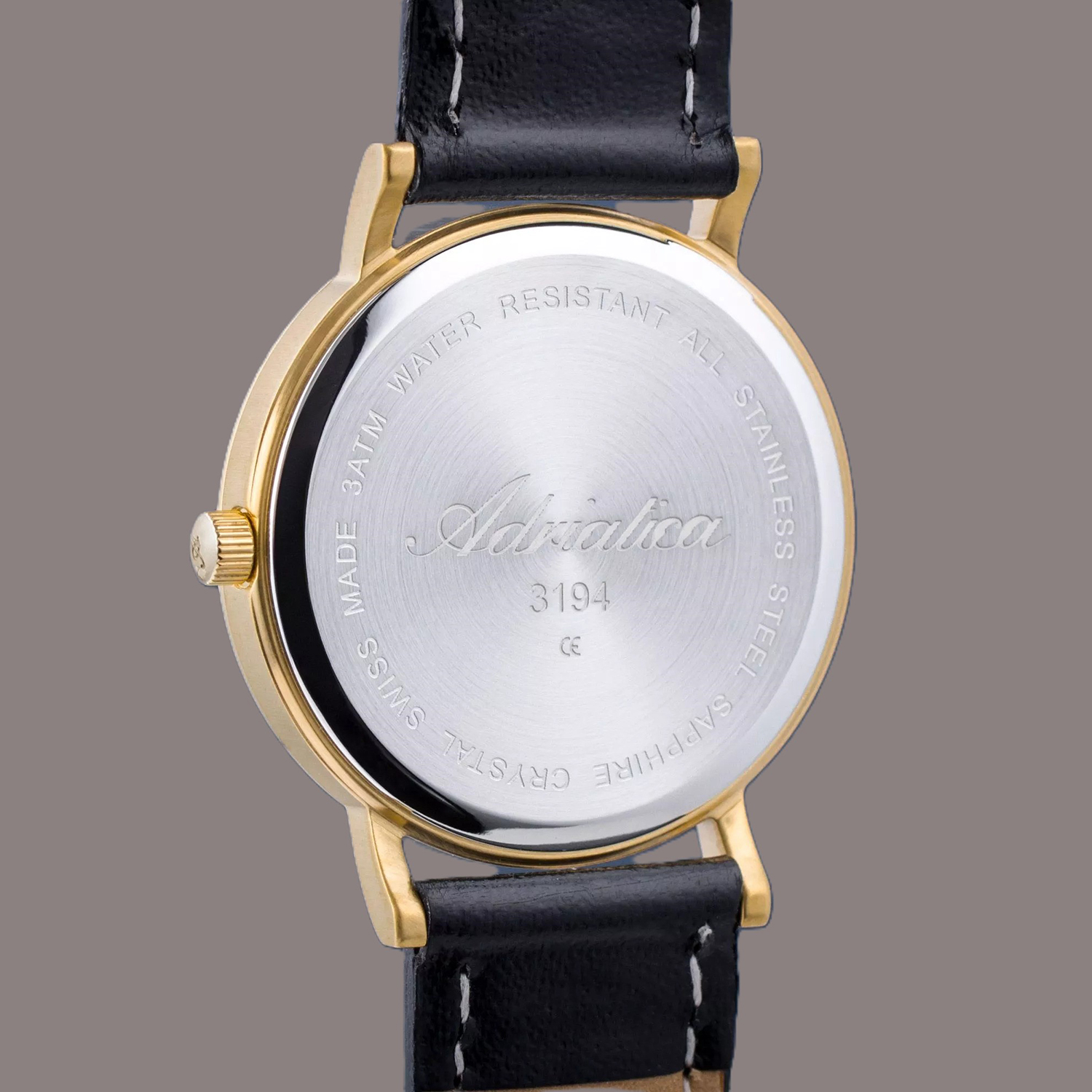 Кварцевые часы. Водостойкость WR 30. Центральные часовая, минутная и секундная стрелки. Индикация даты. Циферблат с часовыми индексами в виде штрихов и цифр. Корпус выполнен из нержавеющей стали с PVD покрытием. Диаметр корпуса 31 мм, толщина 7 мм. Устойчивое к возникновению мелких механических повреждений сапфировое стекло. Кожаный ремешок черного цвета.